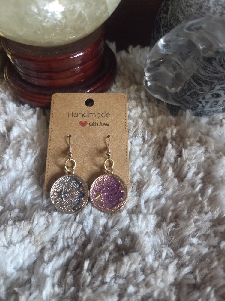Handmade Celestrial Moon Asymmetrical Earrings Elegant handmade earrings featuring a stunning silver and purple design. Perfect for adding a touch of sophistication to any outfit. Smoke pet sick free home All metal is hypoallergenic and nickel free Bundle and save or feel free to send an offer Thank you for supporting my home