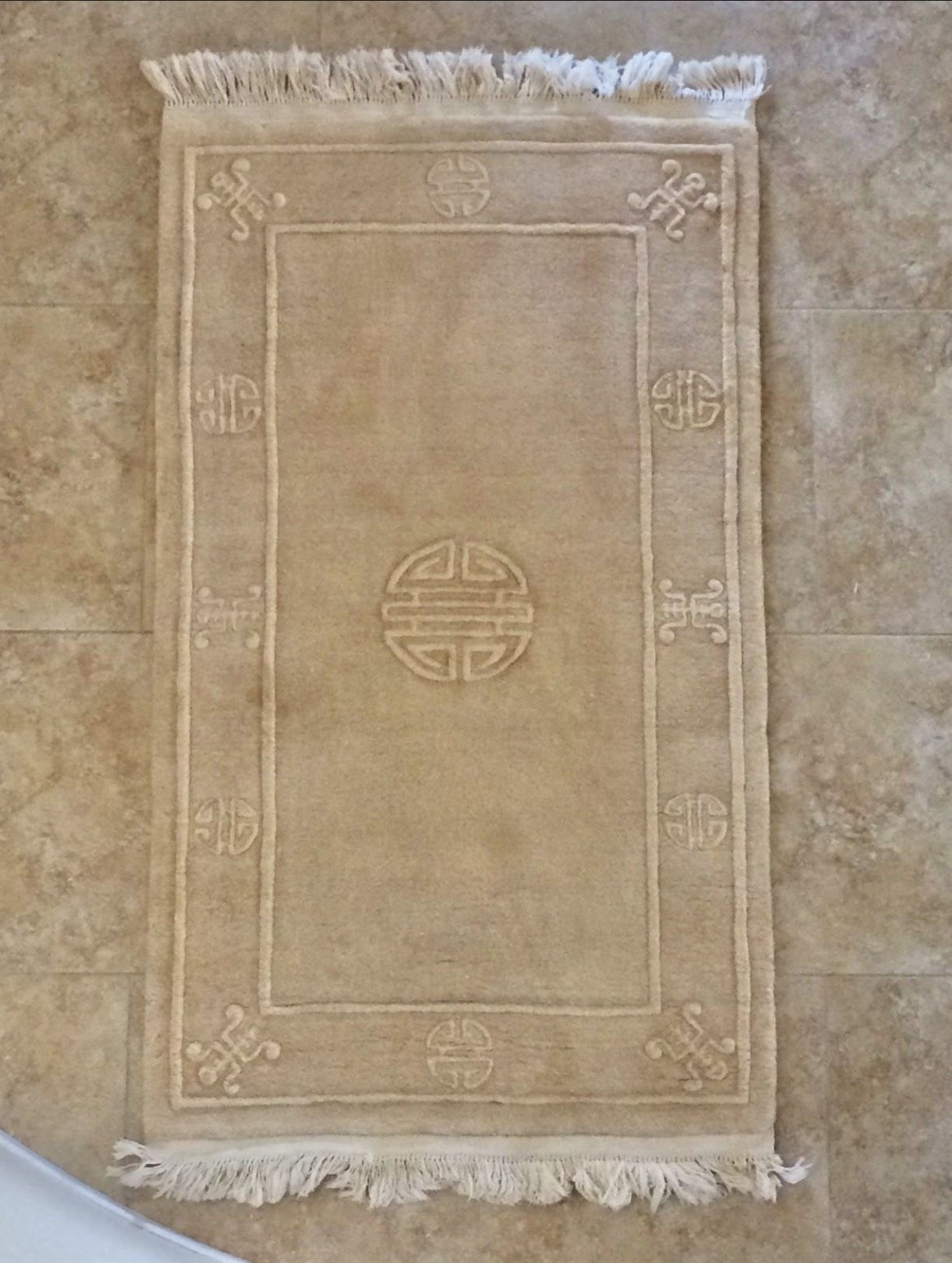 This is a hand knotted Chinese rug in ivory. The foundation of this rug is cotton (so it is natural and plant based) and the pile is lambswool (animal-based organic texture). This is a beautiful artwork from the 1960's. It takes many months to make a rug like this by a weaver on the loom. The size is 3' x 5' 9" (including fringes\tassels). It has carved classic Chinese designs. This rug was professionally hand washed, sanitized, and deodorized. It was appraised for $900. Good condition - this rug was professionally hand washed, sanitize, and deodorized.