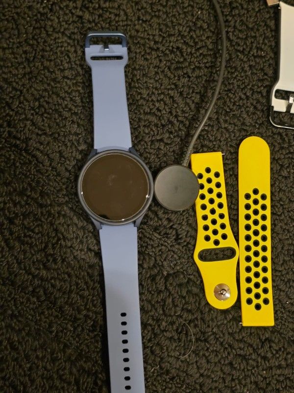 SAMSUNG Galaxy Watch 5 44mm Bluetooth Smartwatch w/Body, Health, Fitness and Sleep Tracker, Improved Battery, Sapphire Crystal Glass, Enhanced GPS Tracking, Blue *** 3 belts extra included. ***Wireless charger ***Case to protect from scratch Product details Top highlights Operating SystemWear OS Memory Storage Capacity16000 MB Special Feature->Sleep Monitor, Blood Pressure Monitor, Activity Tracker, GPS Connectivity Technology -> Bluetooth Wireless Communication StandardBluetooth, 802.11a/g/n/ac Battery Cell Composition ->Lithium Ion ADVANCED SLEEP COACHING: ->Manage your overall sleep quality with an advanced sleep tracker that detects and analyzes sleep stages while you rest; Plus, Advanced Sleep Coaching helps you develop better sleep habits by analyzing your sleep patterns*.Supported Application:Fitness Tracker,Blood Pressure Monitor,Multisport Tracker,Time Display,GPS. Connectivity technology:Bluetooth. Wireless comm standard:Bluetooth,802_11_AGNAC BODY COMPOSITION ANALYSIS (BIA)**: Galaxy Watch5 provides body composition data right on your wrist; On your own schedule, you can now get readings on body fat, skeletal muscle, body water, basal metabolic rate and Body Mass Index (BMI) IMPROVED SENSOR ACCURACY: Stay up to date on your wellness; Get an accurate heart rate thanks to an improved, curved Samsung BioActive Sensor that gets closer to your skin*** AUTO WORKOUT TRACKING: Make the most of every adventure with Auto Workout Tracking — from running to rowing to swimming — automatically in just minutes, and manually tracking more than 90 exercises, including complex activities like HIIT**** IMPROVED BATTERY & GALAXY CONNECTED EXPERIENCE: Meet the watch that goes as long as you do; Galaxy Watch5’s improved battery keeps up with your busiest day***** Do more with synced Galaxy devices that work in perfect harmony****** SAPPHIRE CRYSTAL GLASS: Galaxy Watch5 can stand the test of the hardest days; Its sapphire crystal glass face is 1.6x stronger, resisting the problems that come with life’s daily routines***** ENHANCED GPS: Get out there; Explore the great outdoors; Now you can wander all you want and still know where you are; Galaxy Watch5 features enhanced GPS with voice navigation right on your wrist