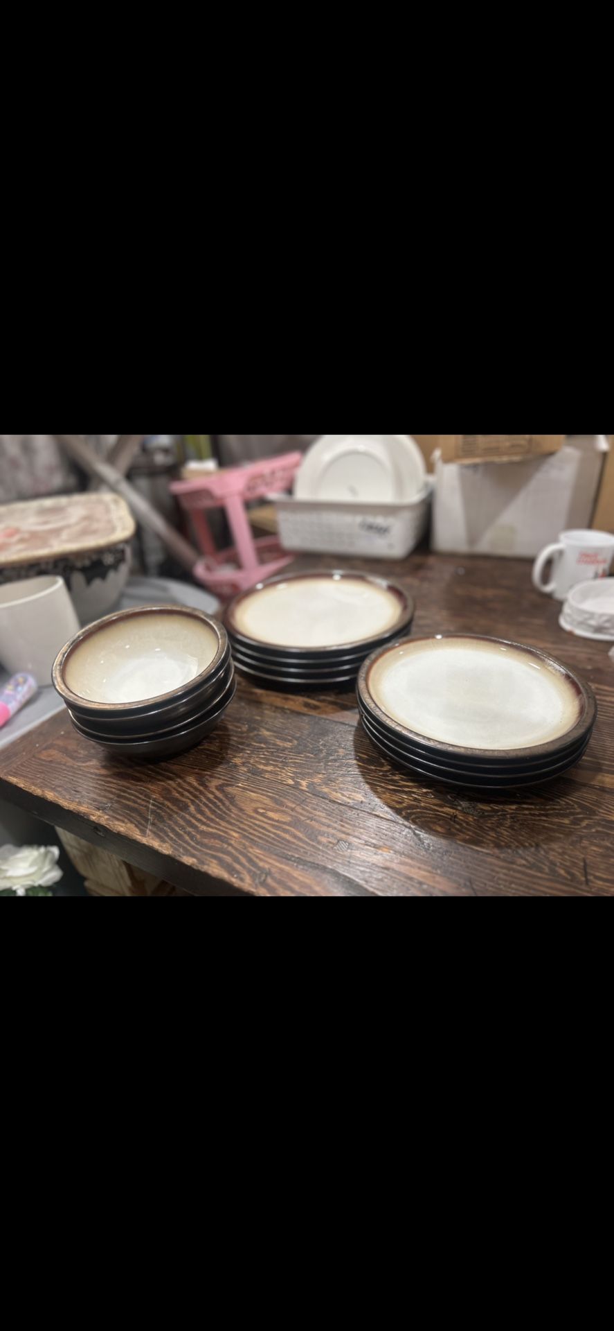 Color: Bronze and oatmeal 4 large plates 4 medium plates 4 bowls 4 mugs You are welcome to check out my other items. All items are previously owned unless specified otherwise. I’m open to offers, please no lowballing🚫items are for pick up, I also shipping, shipping cost will be added to price. I’ll give you a better deal if more than one item is purchased. No holds unless you pay first through Zelle or Venmo.