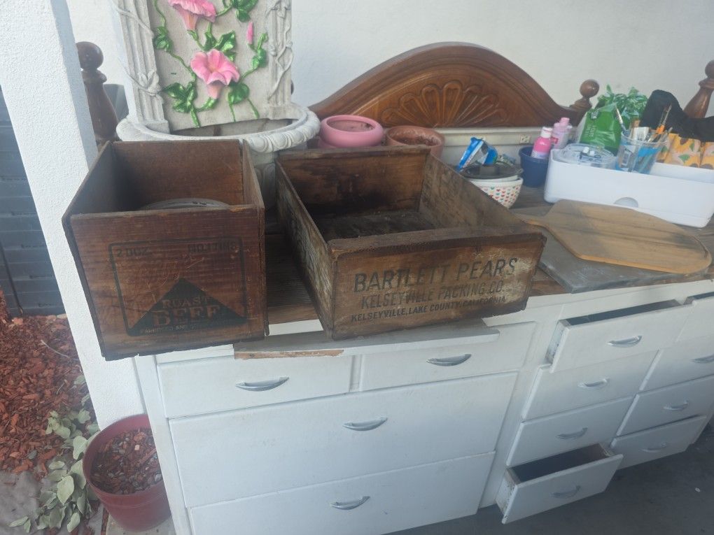 Selling intact antique wooden vegetable boxes tables still readable one is libbys roast beef and the other Bartlett pears selling both for 25 for each one