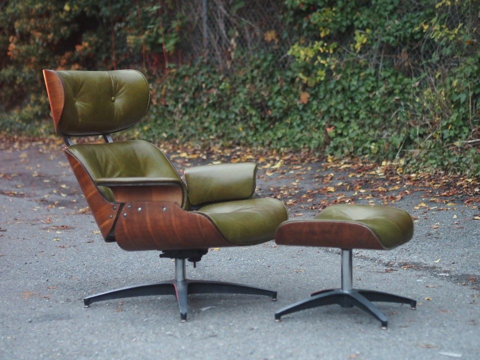 These photos were taken just before completing the restoration of this vintage Selig lounge chair, and they display the nicely refinished walnut shells as well as the newly upholstered, olive green leather cushions. Quite an upgrade from the original vinyl. The chair is solid, comfortable, and available.