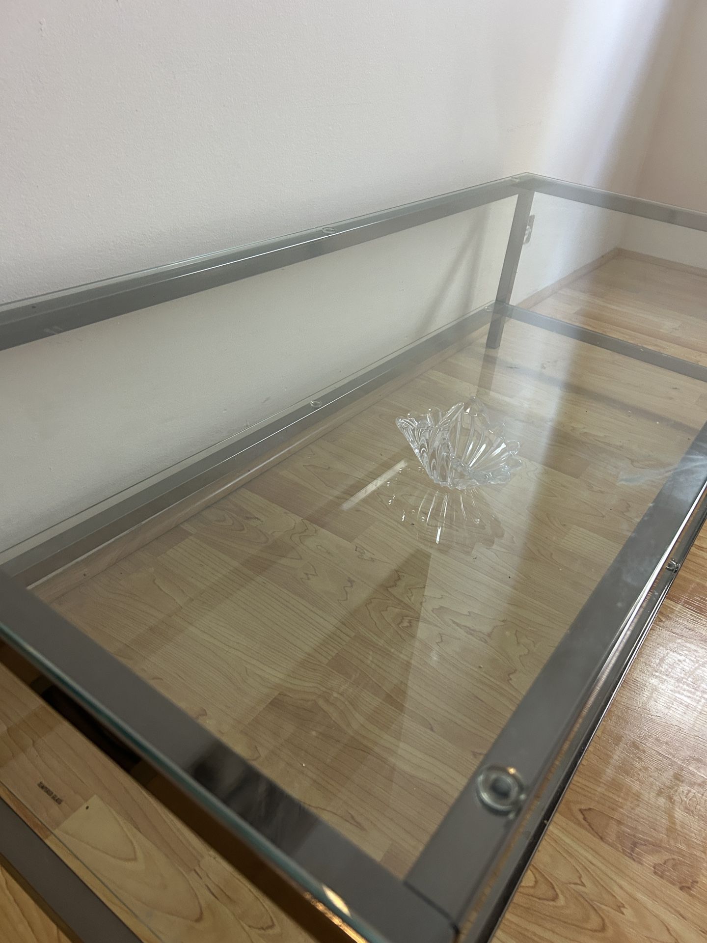 Coffee table two tier glass with chrome frame .. One of a kind 54" long x 23" wide x 15" tall No cracks or issues Looks beautiful $65 obo
