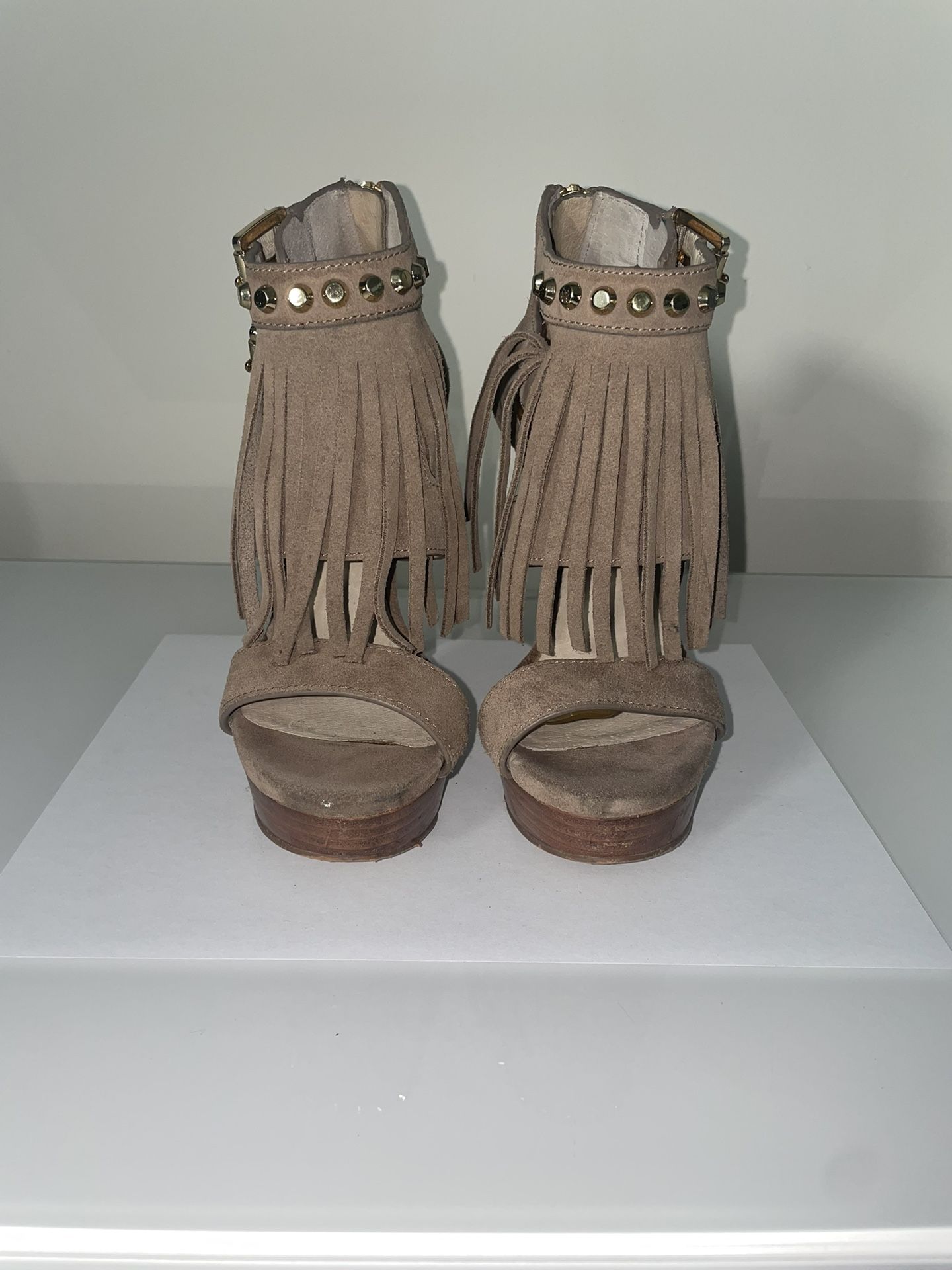 Tan Suede Platform Fringe Heels