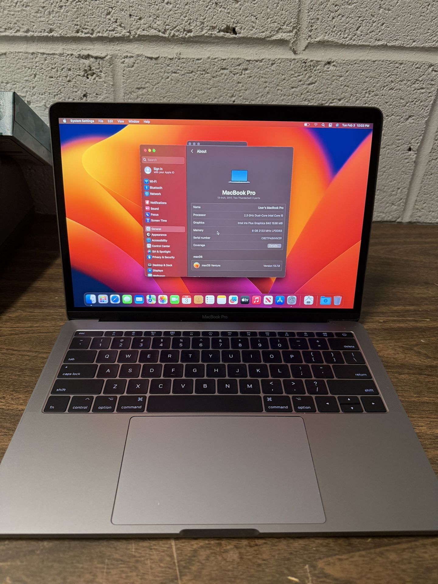 MacBook Pro (13 inch, 2017) Model: A1708 Screen Size: 13 inches Color: Space Gray Processor: 2.3 GHz Dual-Core Intel Core i5 Ram: 8GB Storage: 256GB Graphics: Intel irs Plus Graphics (contact info removed) MB OS: Ventura No Charger No Box Local pick up by Sutton place, all sales are final.