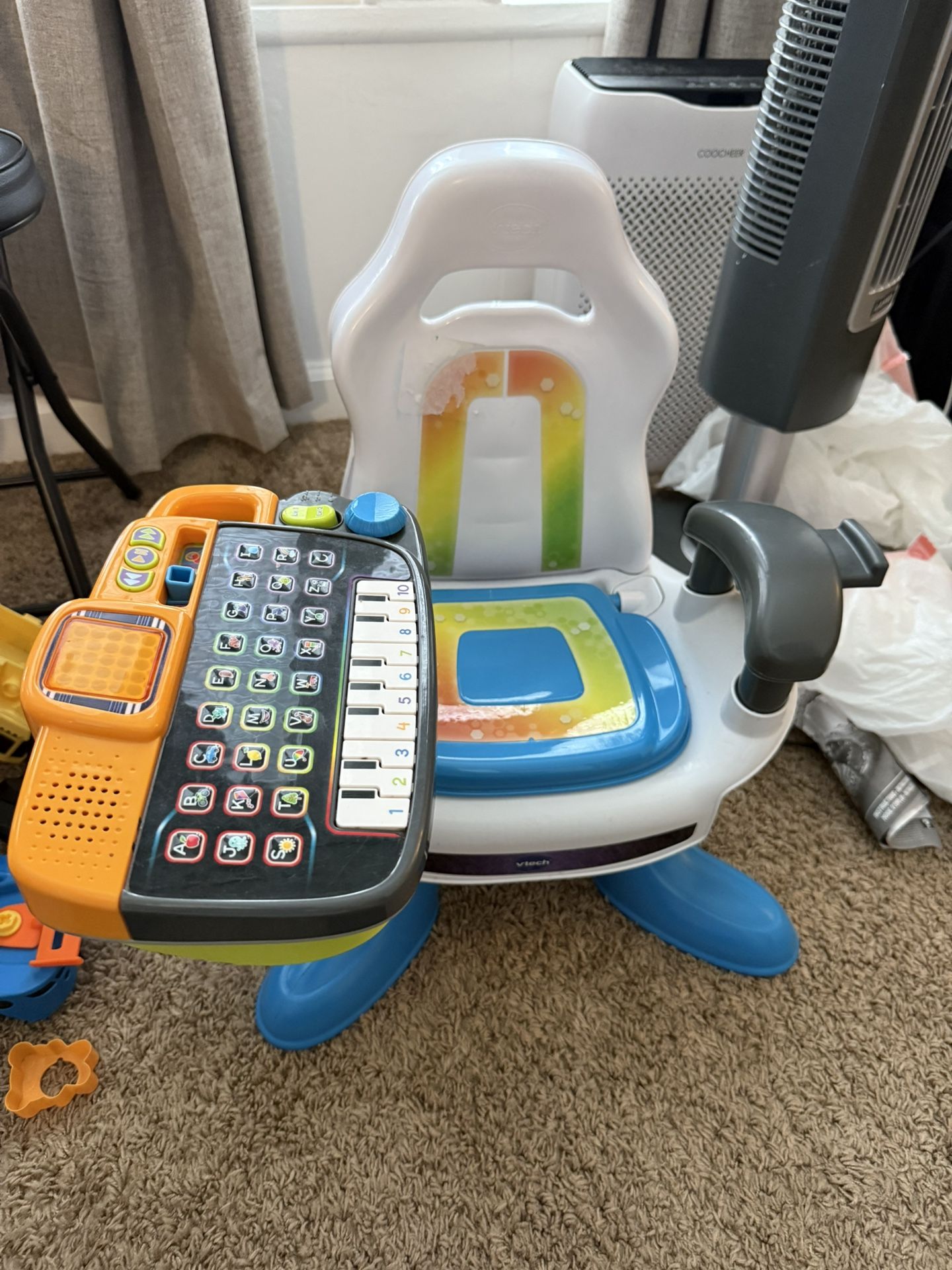 * Level Up Gaming Chair, Removable Gaming Tablet, Pretend Headphones, Quick Start Guide Developmental Benefits: * Language development * Role-Play * Auditory stimulation * Visual awareness Grab a seat, it's game time! Let little ones "game" just like their favorite adults with the Level Up Gaming Chair. Encourage next-level learners with a removable gamer tablet that teaches letters, numbers, animals and music. * Parent-friendly features include volume control for quieter play, a durable design and an automatic shut-off. * Feel like a real gamer with a swivel chair, pretend headphones, and an interactive gaming tablet that teaches letters, numbers, phonics and animals. No internet required.