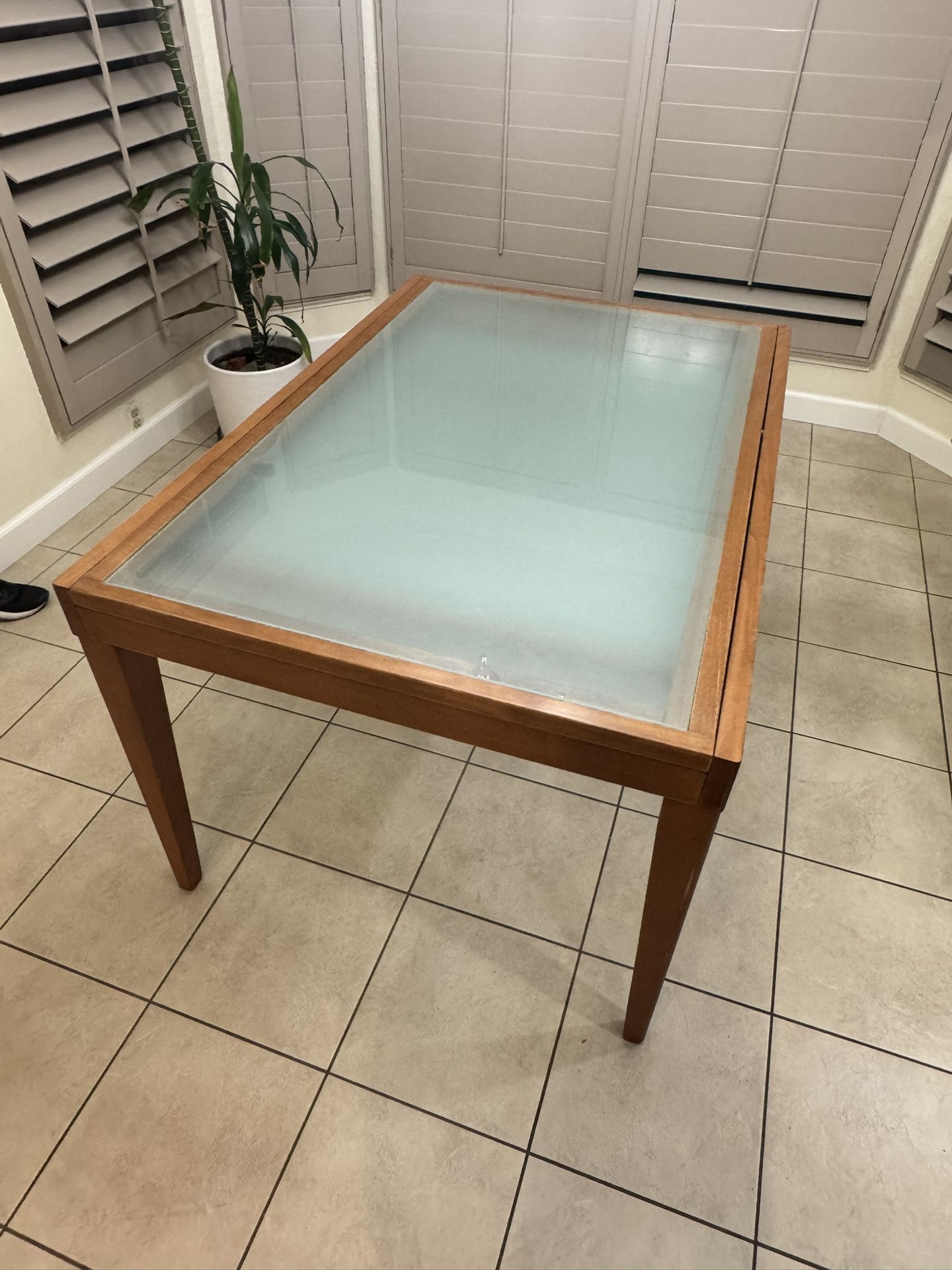 TABLE ONLY- no chairs Selling my dining table with a frosted glass top and teak wood base. It has a built-in extension that slides under the main tabletop when not in use. There’s some normal wear and tear, but it’s still in good shape and very solid. 36in Wide 30in Tall 51in Long 91in Long with extension (extension slides under the main glass for storage) Pick up only (Located near Lakewood Elementary in Modesto)
