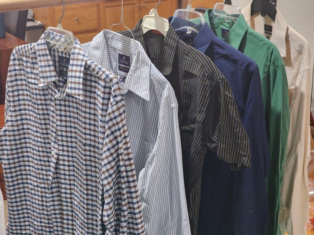 Six men's button and collar shirts, five long sleeves, one short sleeves. Brand are Stafford and Arrow. Size is 16 1/2 34-35