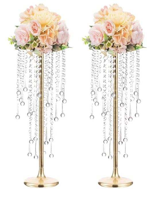 2 Pcs Crystal Flower Stand Wedding Centerpieces for Tables, 21.7 in Tall Tabletop Gold Metal Flower Arrangement Holder, Elegant Bulk Metal Vases for Wedding Party Event Reception, Birthday H37