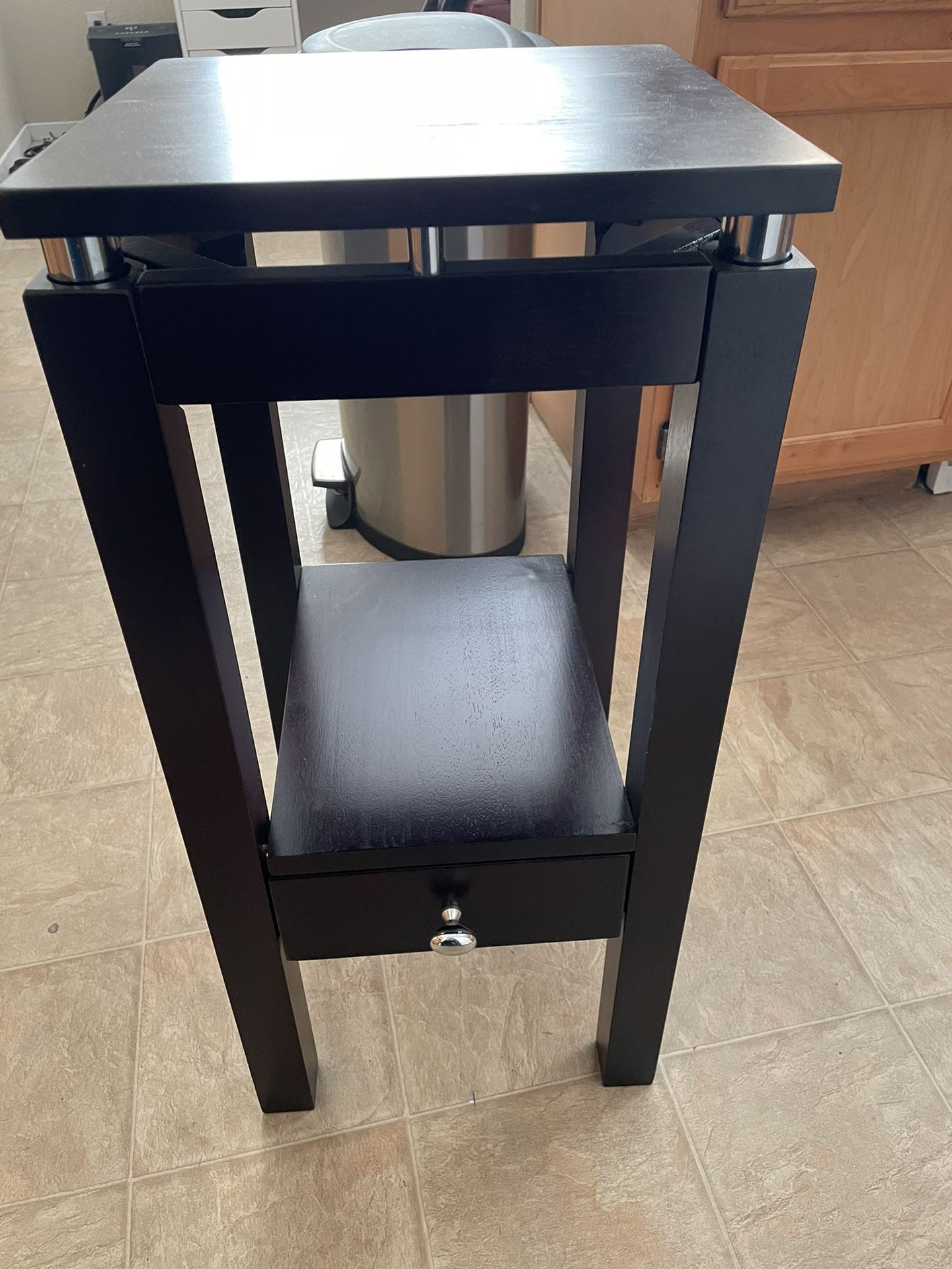 Small shelf with drawer on bottom. Dark cherry color. 29 1/2” H, 13 3/8” W, 13 5/16” D