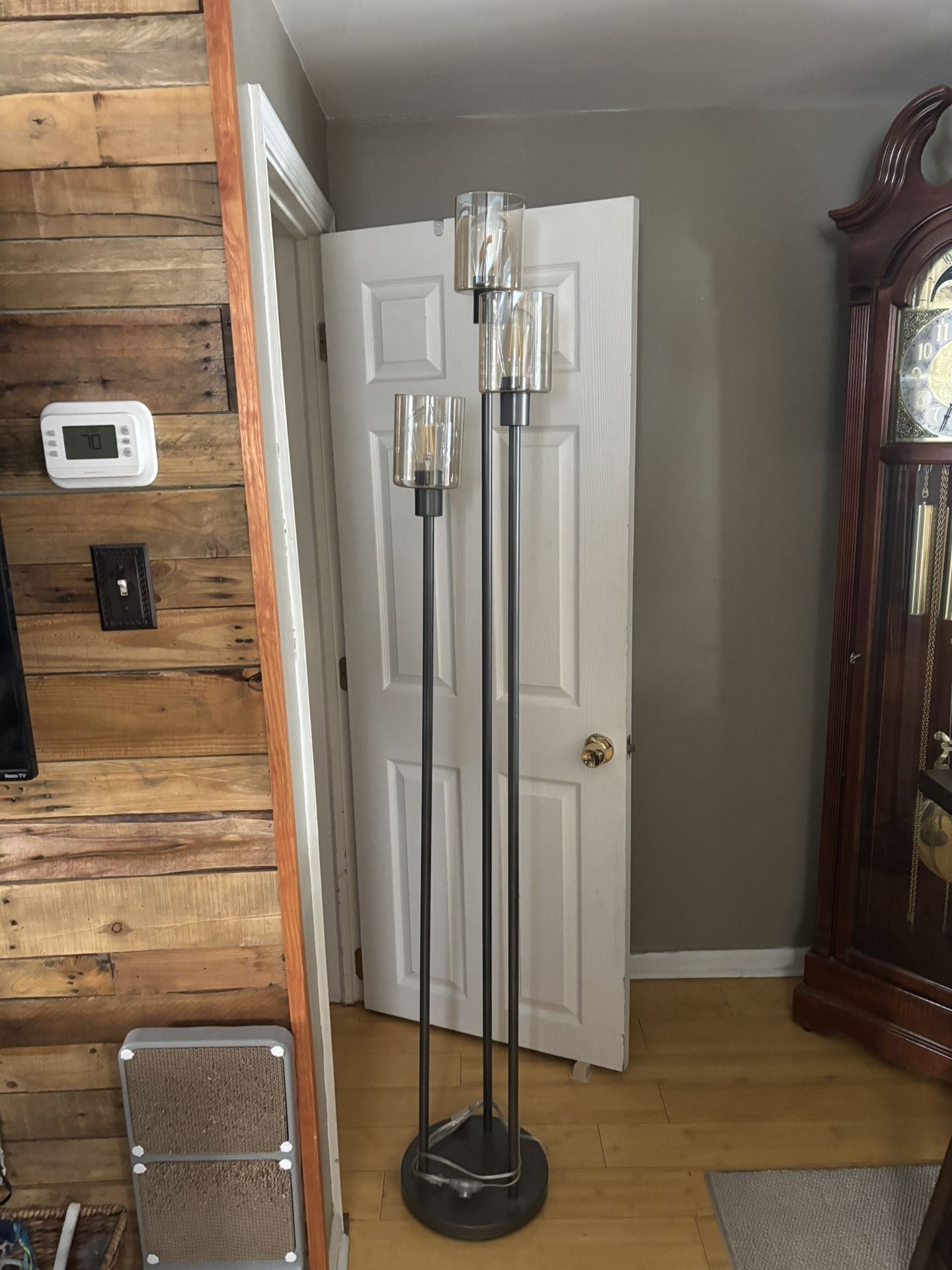 Modern portable three light floor lamp, black finish with clear glass shades, and Edison style bulbs.