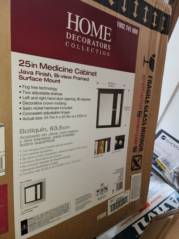 Brand new in Box Home Decorators Collection 25" w x 25" H Rectangular Medicine Cabinet with Mirror Mahogany Wood $75 Located in Inkster