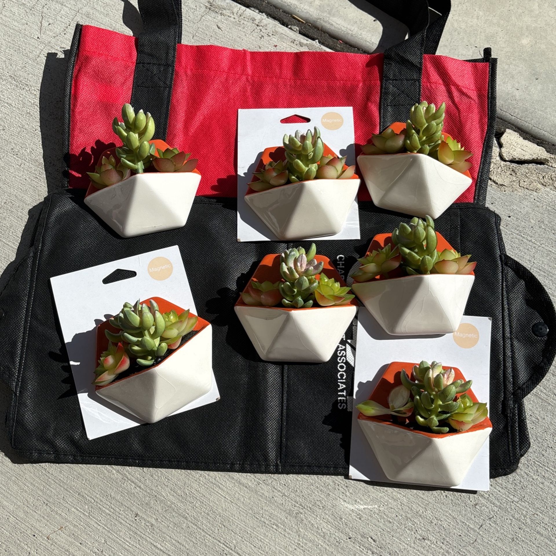 7 artificial succulent wall art pieces Some used, some still in original packaging but not in perfect condition. Magnetic backing Items are not brand new and show signs of wear. Feel free to ask any questions. Thank you for looking!