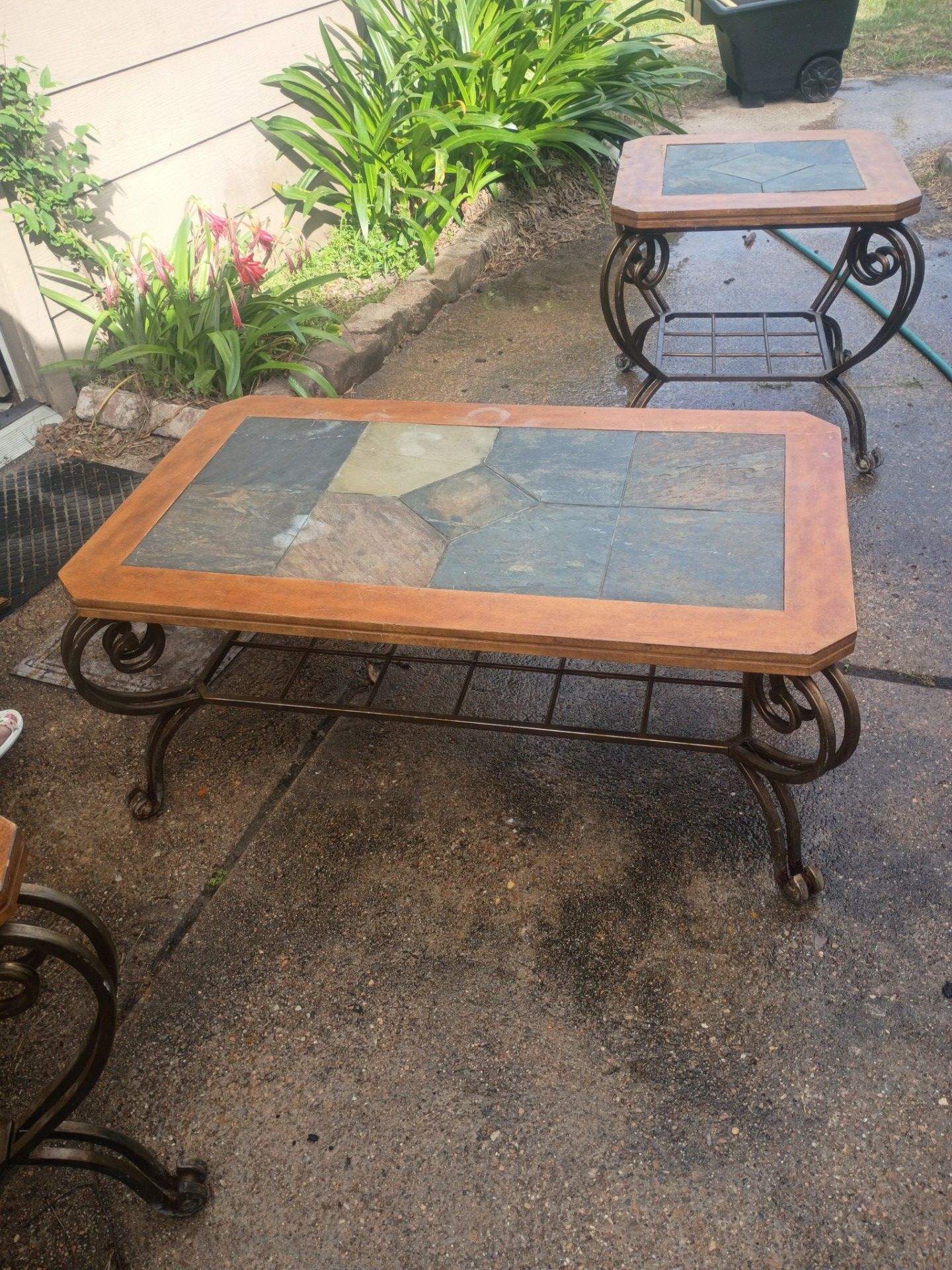 1 coffee table and 2 end tables. Bottom legs are a bit rusted. Press wood and metal.