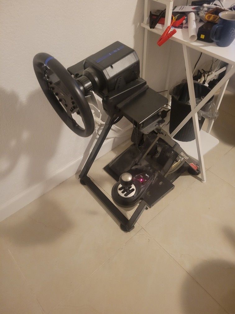 A full set of p x n v ninety nine force feedback racing wheels. Comes with steering wheel frame, wheel, shifter, paddles and configurations.