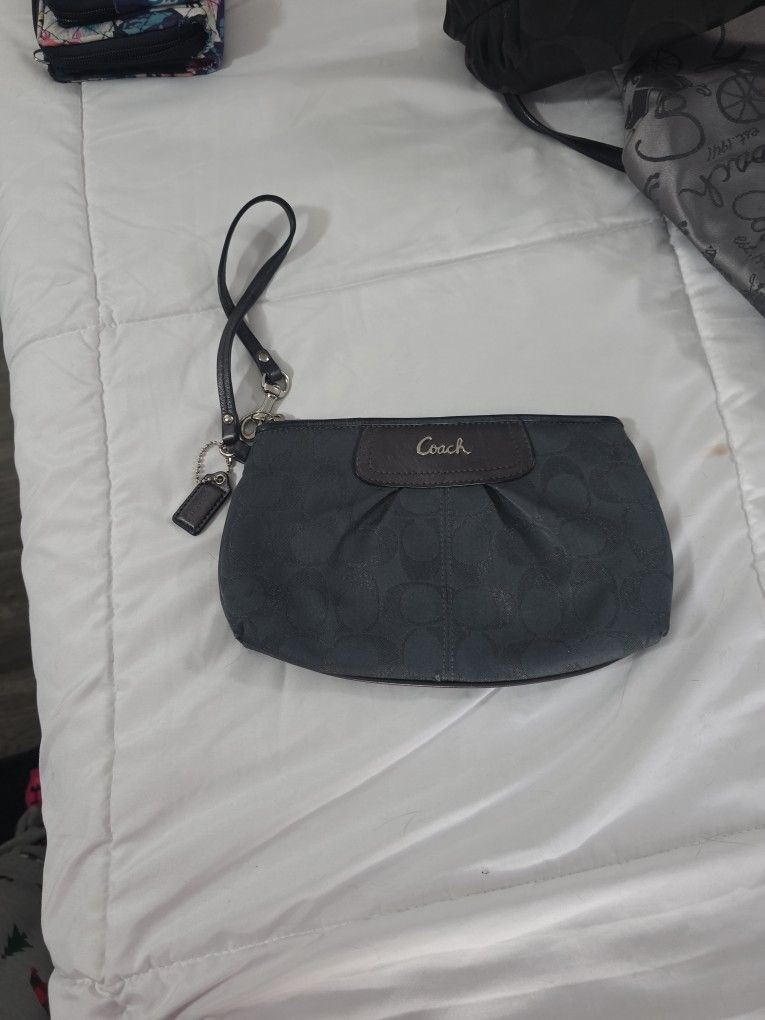 This is a Coach Ashley signature C-design jacquard fabric wristlet in black/gray with patent leather trim and silver-tone hardware.