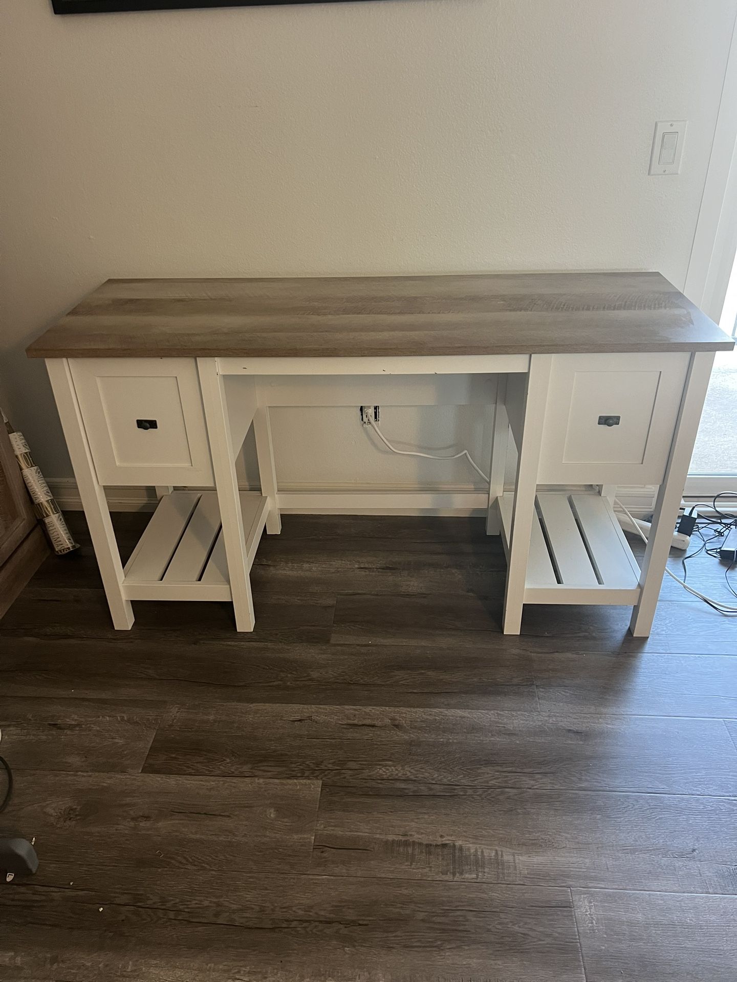White and brown desk with 2 drawers. One drawer holds hanging files.