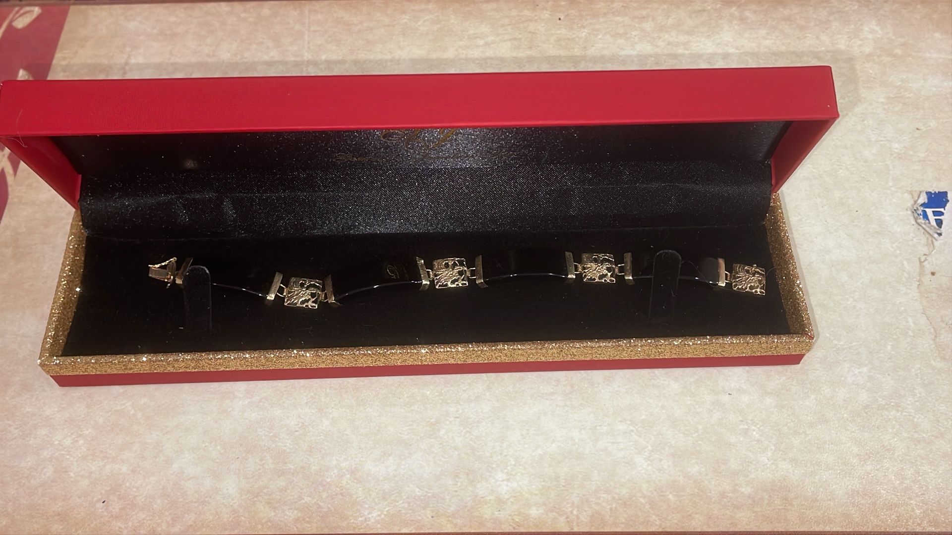 This black onyx and 14k yellow gold link style bracelet is an Asian style Bracelet Quite a lovely piece. Nice size black onyx plaques alternating with smaller onyx plaques. The smaller square plaques have a gold cover depicting an oriental style dragon. Connectors and clasp are also 14k gold. The almost 1/2" width of the onyx plaques give this bracelet some substance. It is in excellent used condition! 7 1/2 long Beautiful box perfect Christmas gift π