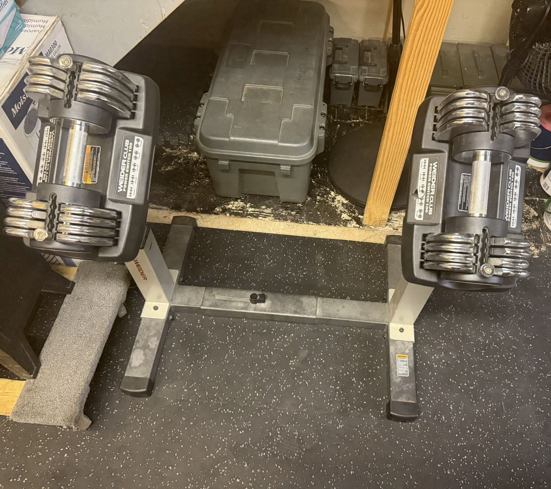 2 adjustable dumbbells up to 50lbs each with adjustable width and height stand.