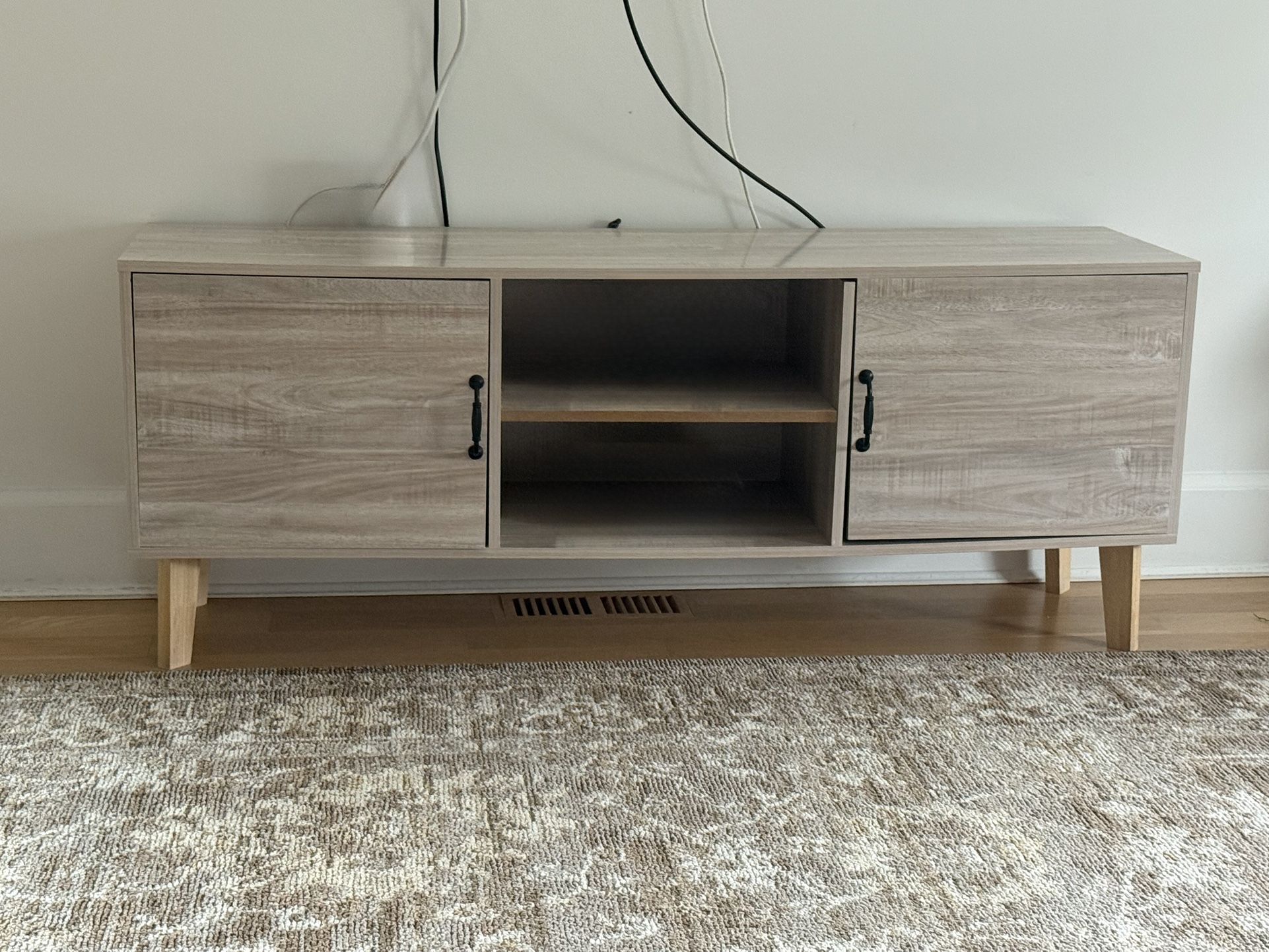 Can fit a 65 in tv. Has 2 cabinets that are a little wobbly but overall fine.
