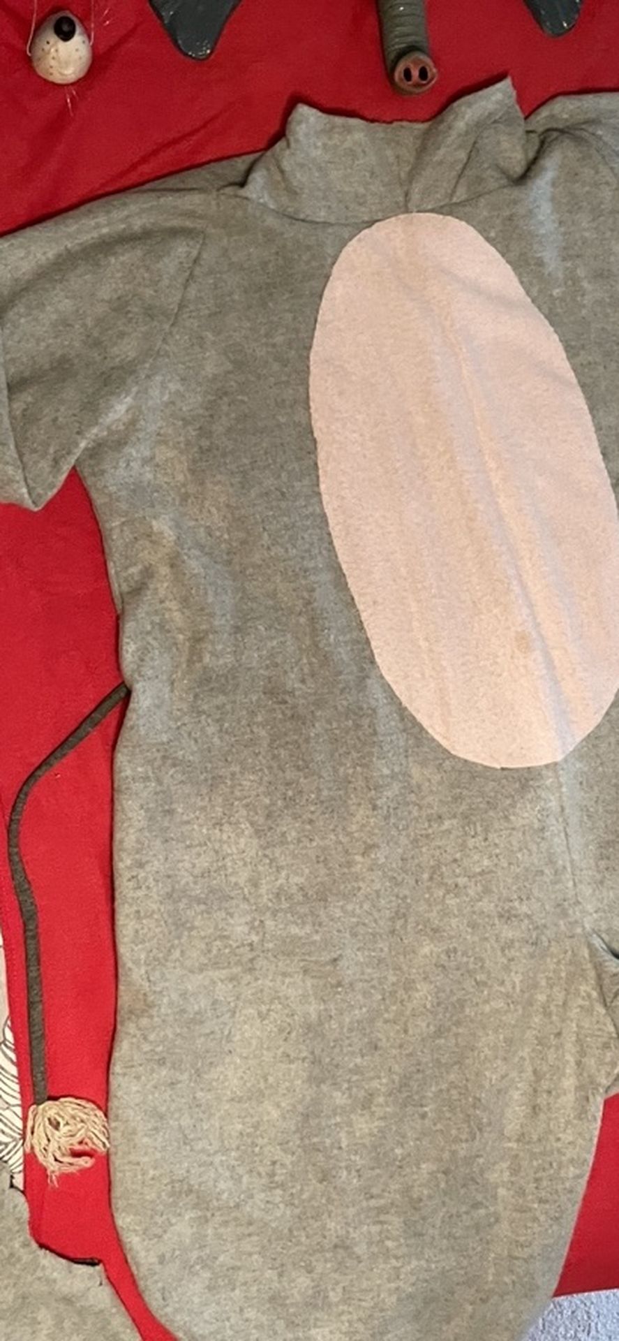 This costume works two ways! You can be an Elephant or a Giant Mouse! The big roomy grey costume is made with soft material that is so comfortable to wear! Elephant comes with ears and trunk and grey mitts. Mouse comes with nose & whiskers and grey mitts. Super comfortable and soft material! For man or woman!