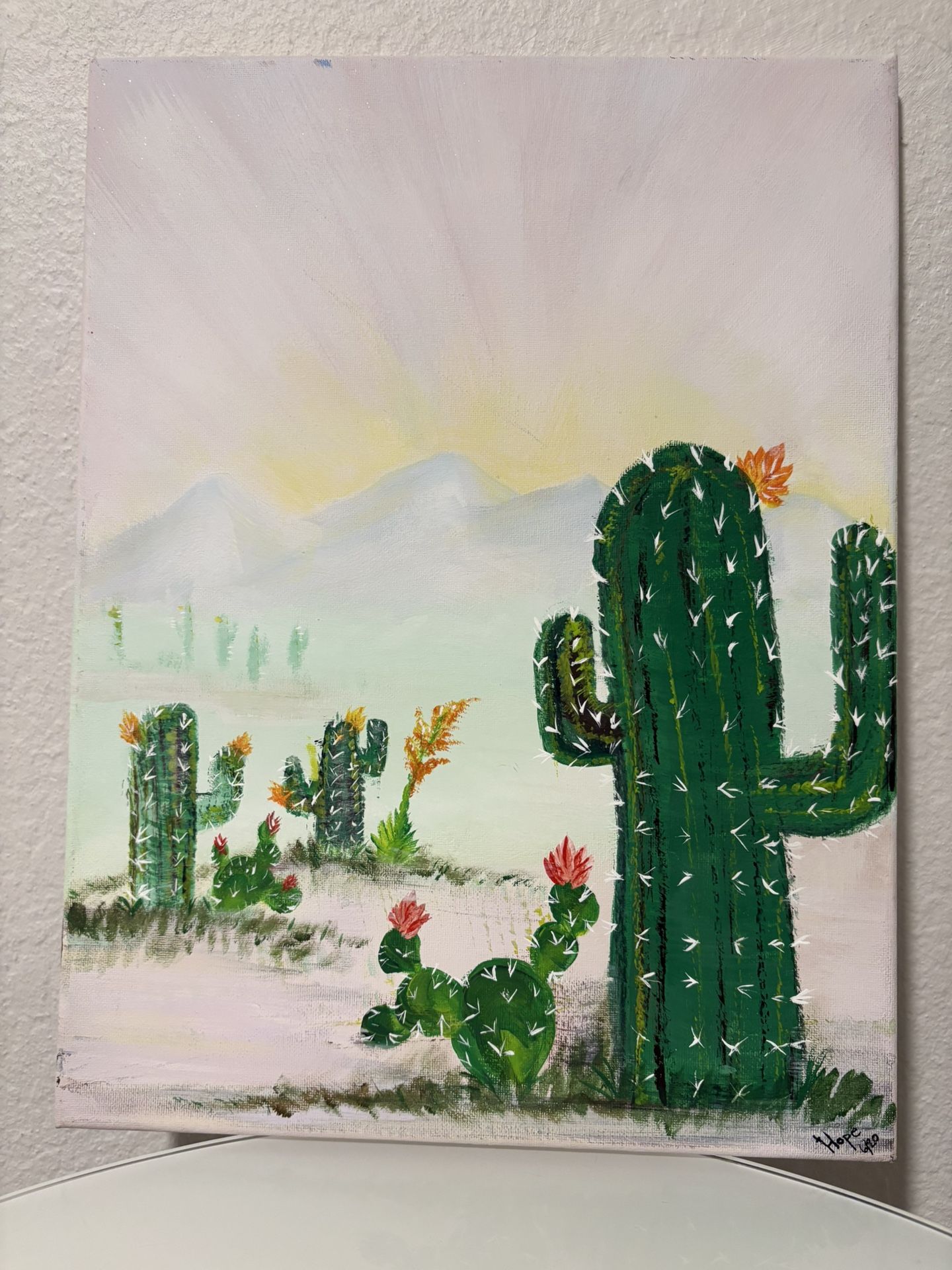 Dimensions: 16” Tall x 12” Wide Colorful acrylic painting featuring saguaros and prickly pear in a desert landscape. Canvas on wood frame. Signed. Pickup location is near N. 60th Street and Greenway, Scottsdale.