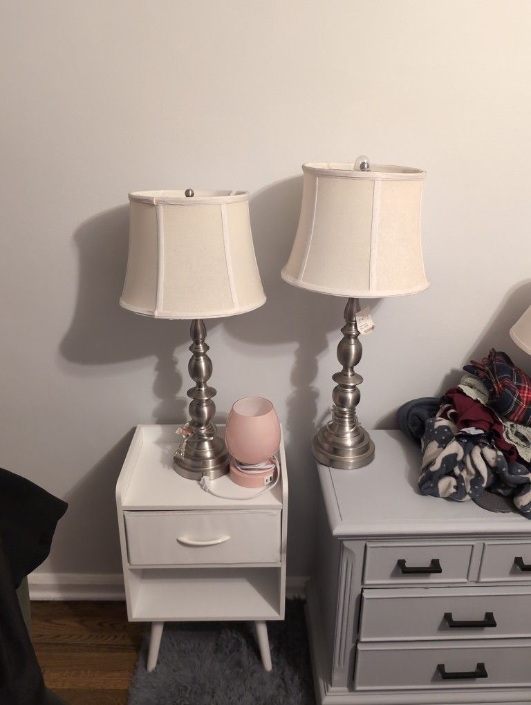 Two silver lamps with cream colored shade. Original tags still attached. Another touch lamp light pink. White end table with drawer. All items are like new