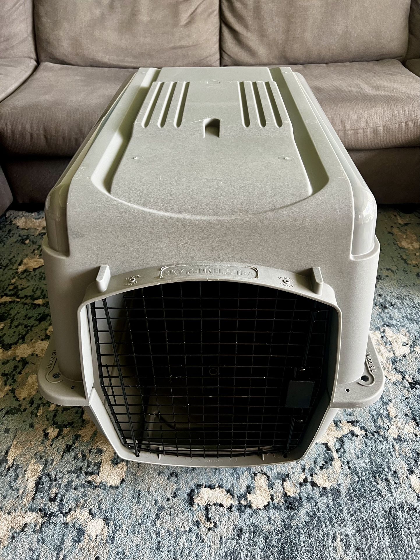 DESCRIPTION: Only used once. Like new! Retail cost $189.00 Dimensions: 32L x 24W x 24H Considered the Gold Standard for pet travel, the Petmate® Sky Kennel® keeps your pet safe and comfortable during car or air travel. This heavy-duty travel kennel is compliant with the standards specified in the 51st edition (2025) of the IATA Live Animals Regulation for live animal transport, including door, side, and back ventilation requirements. It also meets most airline cargo specifications for safe travel; always check with airlines beforehand. The Petmate® Sky Kennel® is Ready-to-Fly. Made in the USA. This plastic dog crate is proudly made in the USA from EcoTEC™ Plastic, which contains a minimum of 90% pre-consumer recycled material engineered for strength and durability critical for a safe pet carrier. The Petmate Sky Kennel meets most air travel requirements. However, we always recommend contacting your airline before traveling to verify their requirements. PRODUCT NOTE: Only 21" and 28" include a handle. All other sizes DO NOT come with a handle. * Eco-friendly product * Made with 90% pre-consumer recycled plastic * Heavy-duty plastic construction * Non-corrosive plastic wing nuts * Easy to operate secure latches * Made in the USA * Four-way ventilation INTERIOR DIMENSIONS: 21" Interior Dims: 18.75" L x 13.5" W x 14.5" H 28" Interior Dims: 24.25" L x 18.25" W x 19.5" H 32" Interior Dims: 29.5" L x 19.75" W x 23.5" H 36" Interior Dims: 32.5" L x 22" W x 26" H 40" Interior Dims: 36.25" L x 24.75" W x 28.8" H 48" Interior Dims: 44" L x 29" W x 32.5" H
