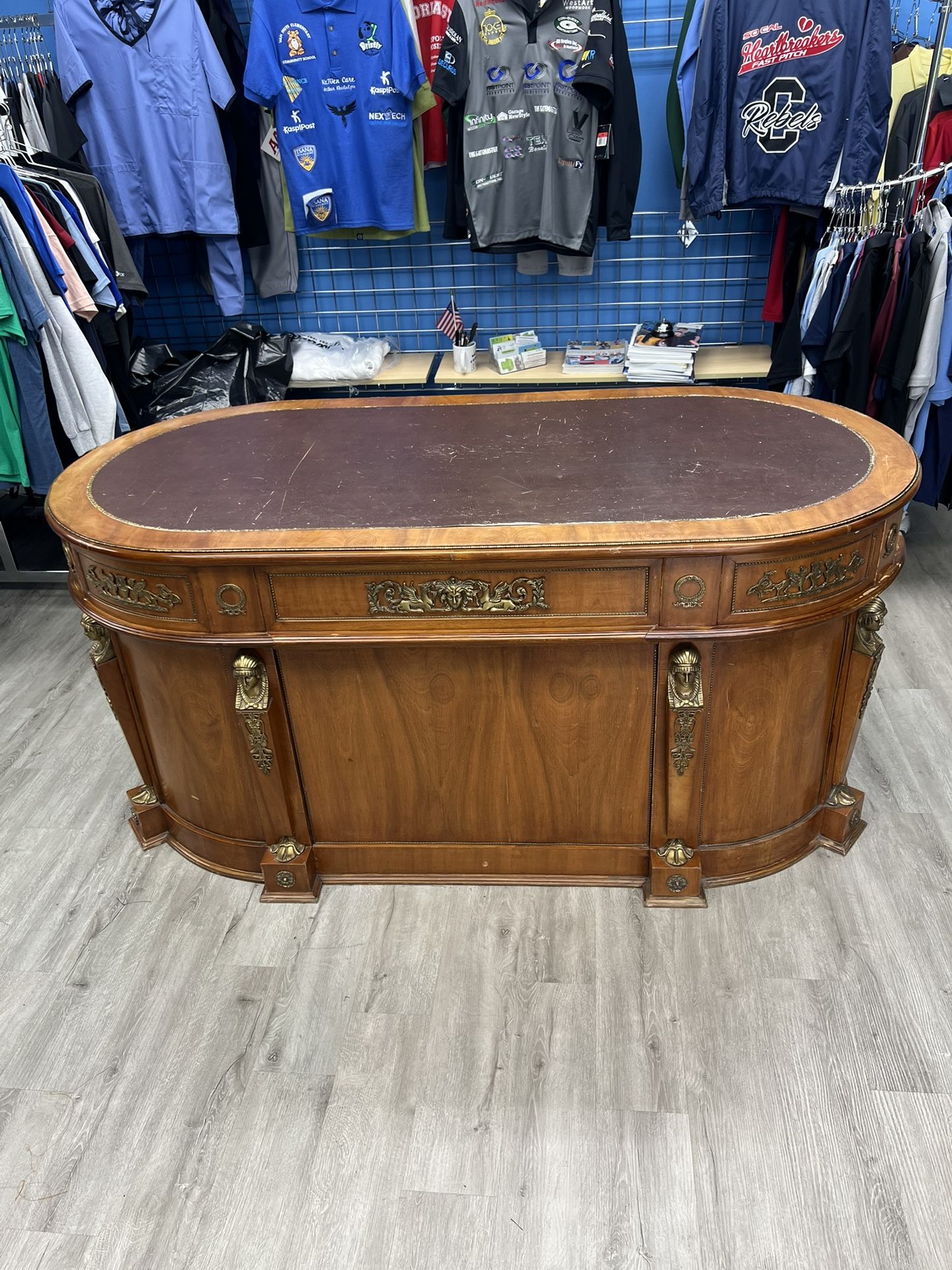 Beautiful Egyptian Classical desk from mid 20th century. The wood is walnut has fantastic details. Need little fixes. 3 drawers on seating side and 2 large side drawers on pedestals. 32” height, 72”-width