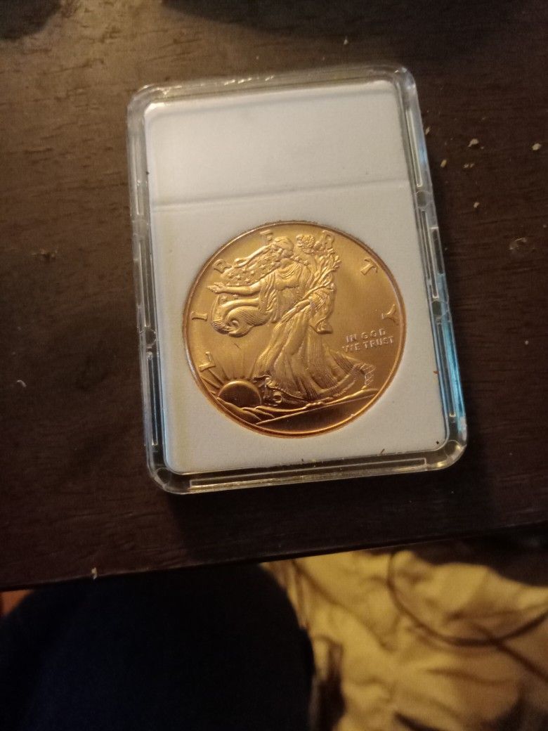 $50 WALKING LIBERTY COMMERATIVE COIN. ROUND .999 TROY OUNZ PURE CU COPPER. FINE. COPPER BULLION. NEW IN. FINE DISPLAY CASE