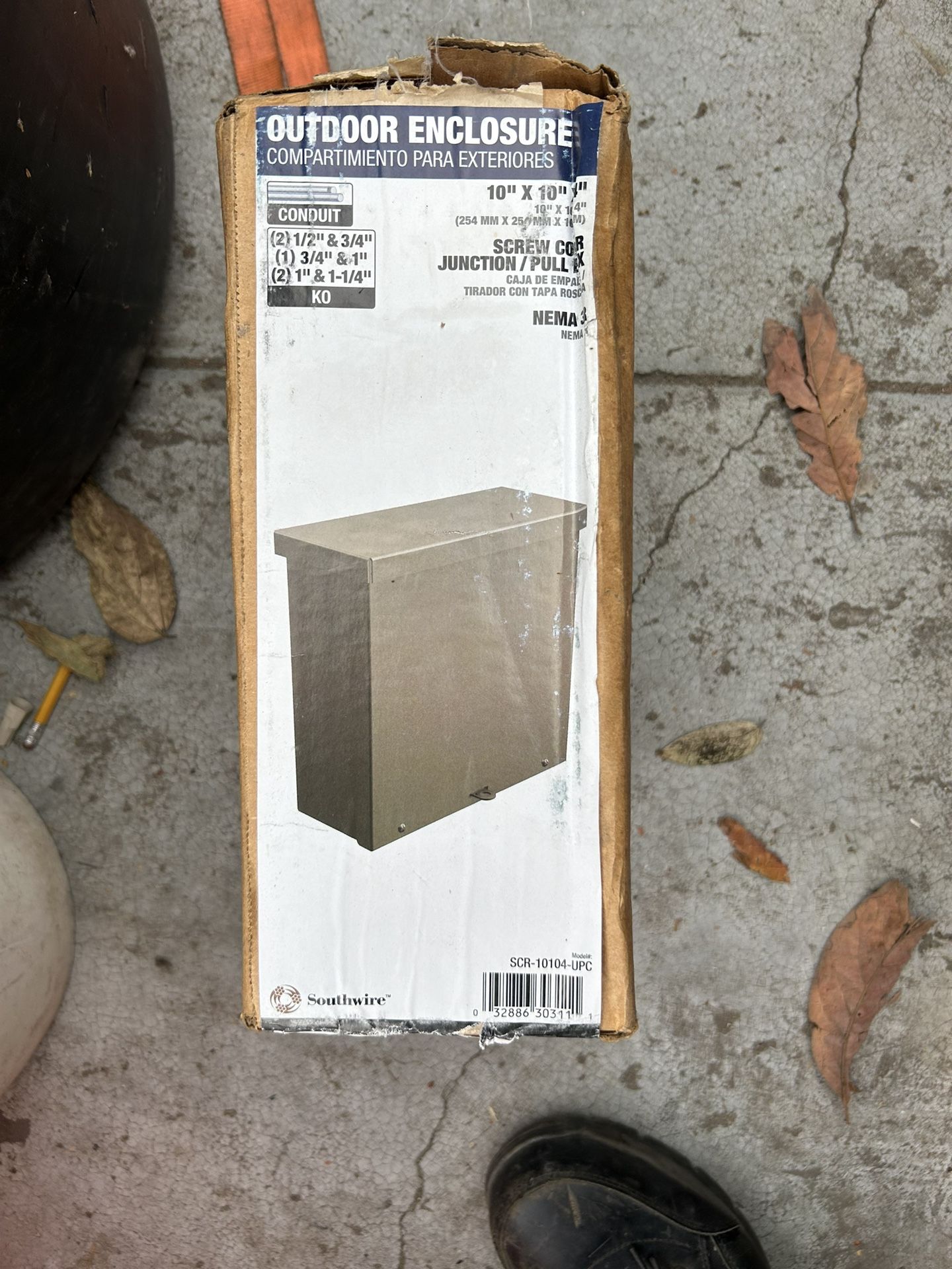 10x10x4 carbon steel outdoor junction box brand new, still in the package. Mega bargain!!! Will go fast!!!
