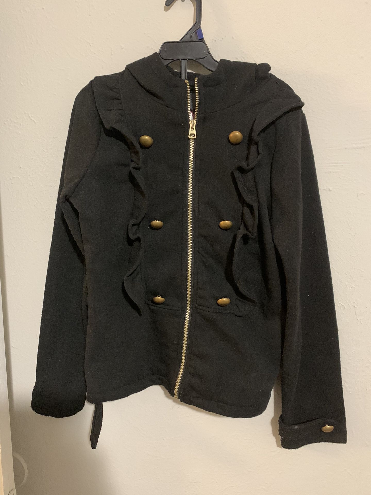 Girls dress up jacket with hood size 14/16 black with gold buttons one came off by the wrist part I have the button somewhere around here. Pick up in Arlington only 76014