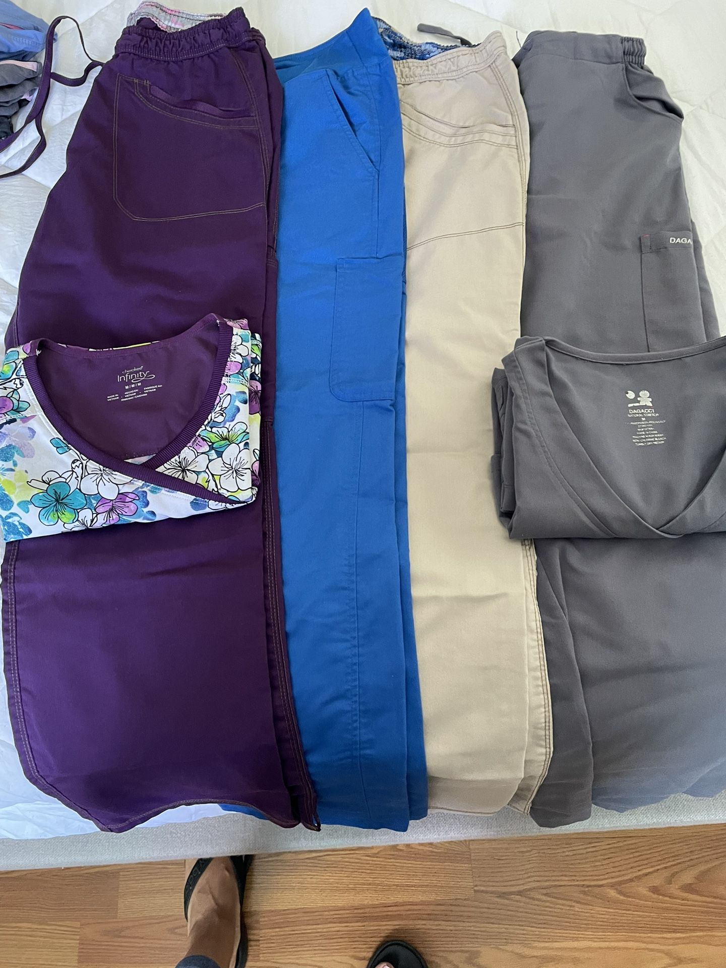 Medical scrubs. Used and in very good condition. All medium size. Tops and bottoms, $5 a piece. Don’t miss this great deal!!