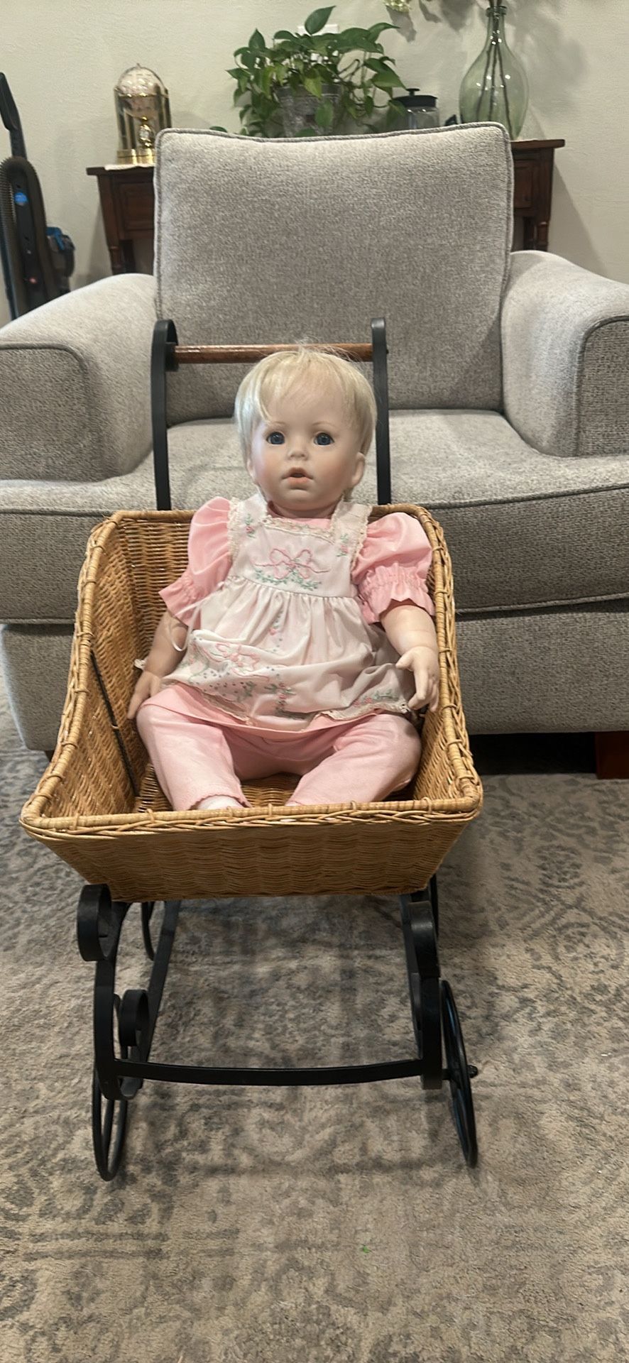 Porcelain doll and vintage stroller