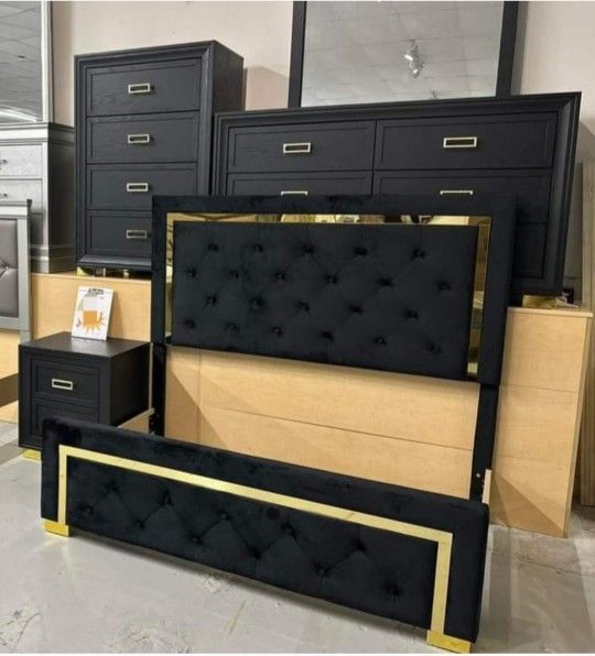 Brand New/Pepe Black/Gold Panel Bedroom Set//Bed,dresser, Mirror, Night Stand, Chest// Mattress Sold Separately