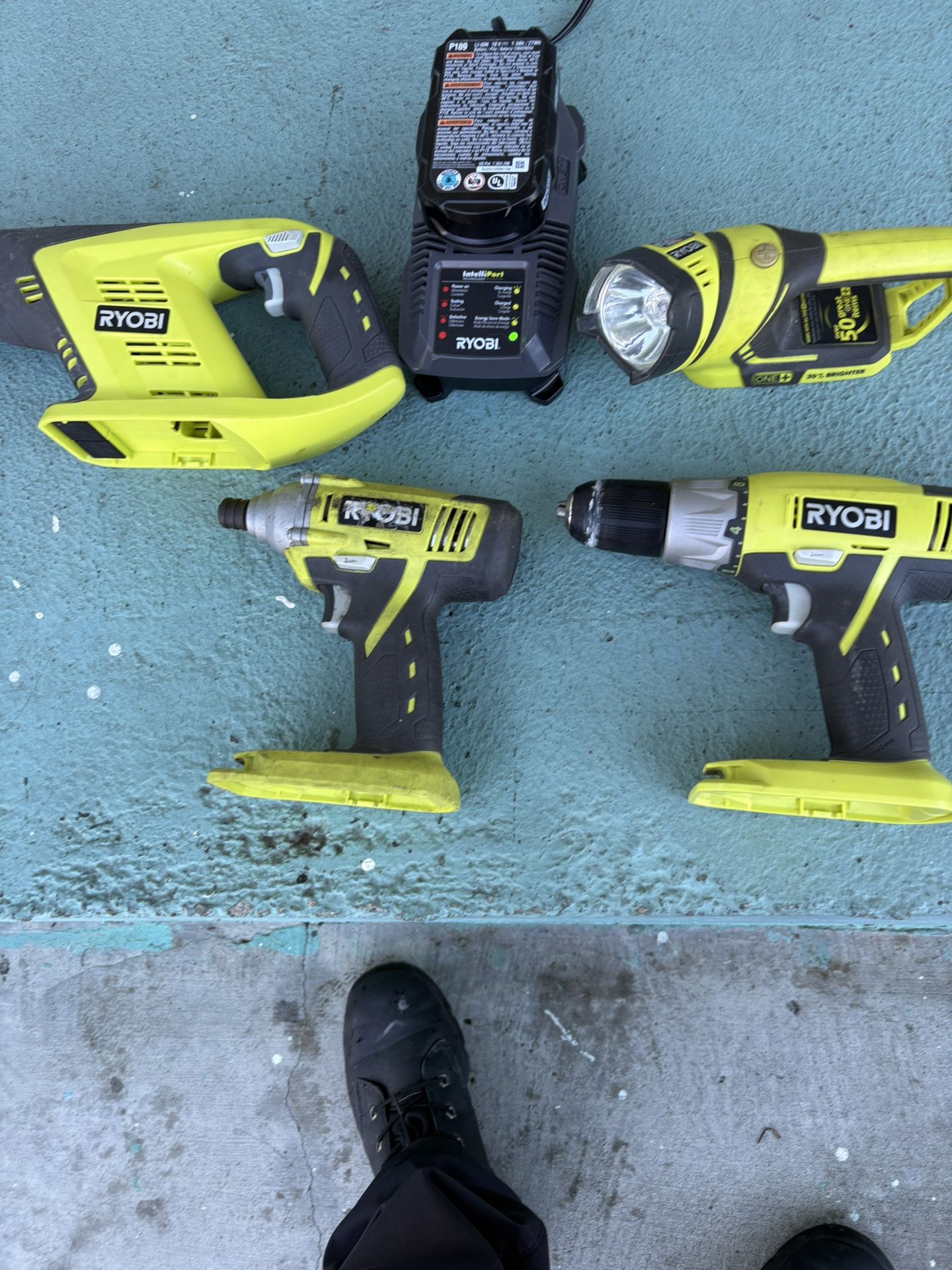 Rioby tools ONE + working great are brand new. 18 vSAW. 18 volts 1/2 2 speed drill driver 18 volts flash light rotating head. 18 volts drill impact 1 battery 18 volts. 1 battery charger. W/ carrier bag