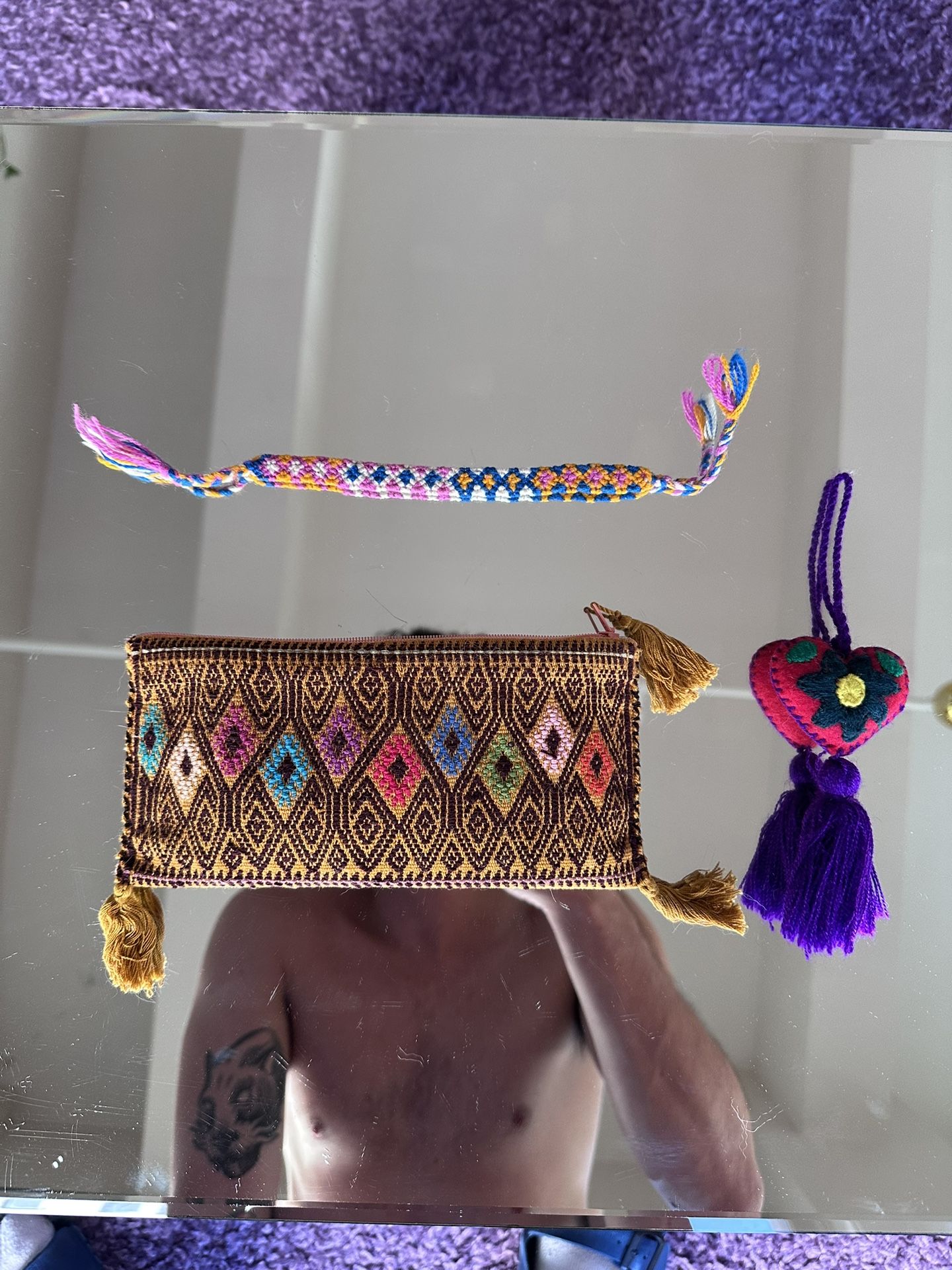π§΅ 1. Mini Textile Pouch Beautifully handwoven with traditional patterns and rich earthy tones, this padded pouch is perfect for storing small keepsakes, jewelry, or coins. Features intricate embroidery and yellow fringe tassels. Approx. size: 3.5β x 3β πΊ 2. Heart Tassel Charm A bold, red felt heart with colorful embroidery and a lush purple yarn tassel. Makes a perfect bag charm, keychain accent, or wall decor piece. Total length: ~6β π 3. Bracelet Brightly woven in a classic diamond pattern with a braided loop closure. A timeless symbol of connection and a cheerful accessory for wrists or ankles. Adjustable fit Asking: $20 for the set Pick up in DTLA