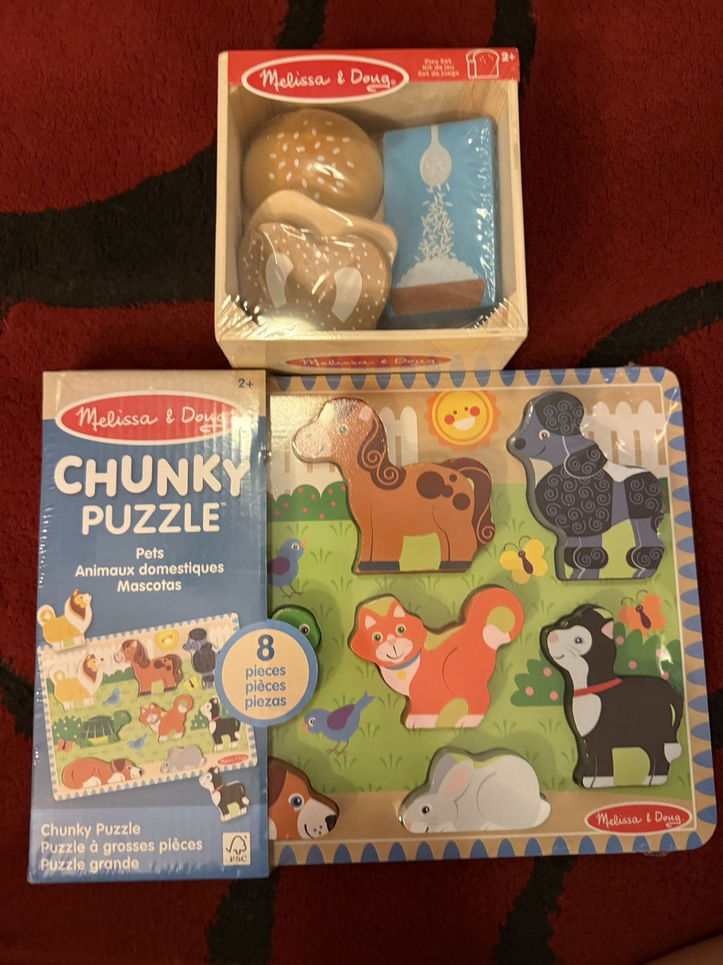 Brand new Melissa and Doug wooden toys. Chunky puzzle and food set. Selling together.