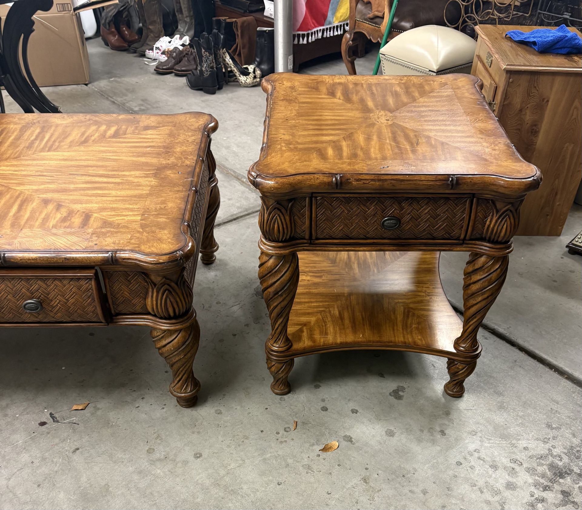 Cocktail Table and End Table by Schnadig Portofino model a tropical or coastal style with Woven rattan drawers front and carved wooden legs.