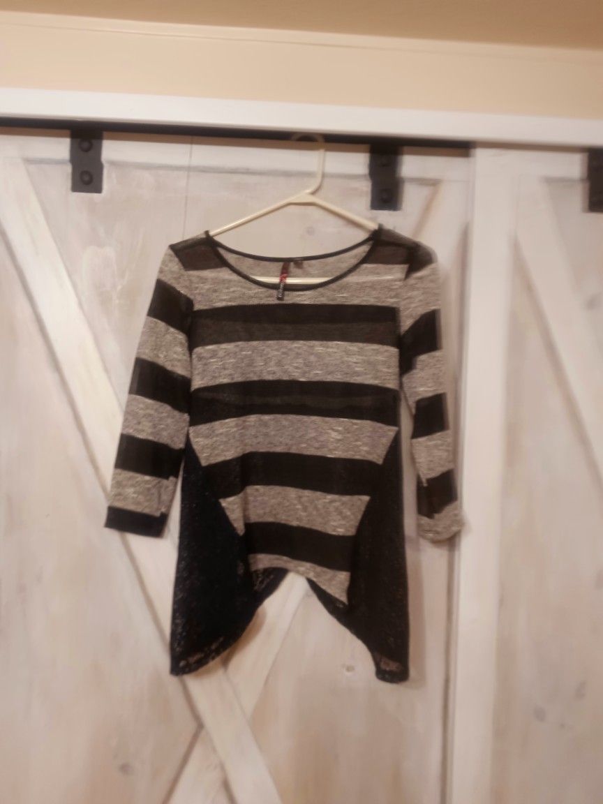 Sweater has a tuxedo style tails out of black lace sweater design that is somewhat shear and wraps around the sides. The black stripes on the bodice in a vertical shearish pattern. It's a small large.