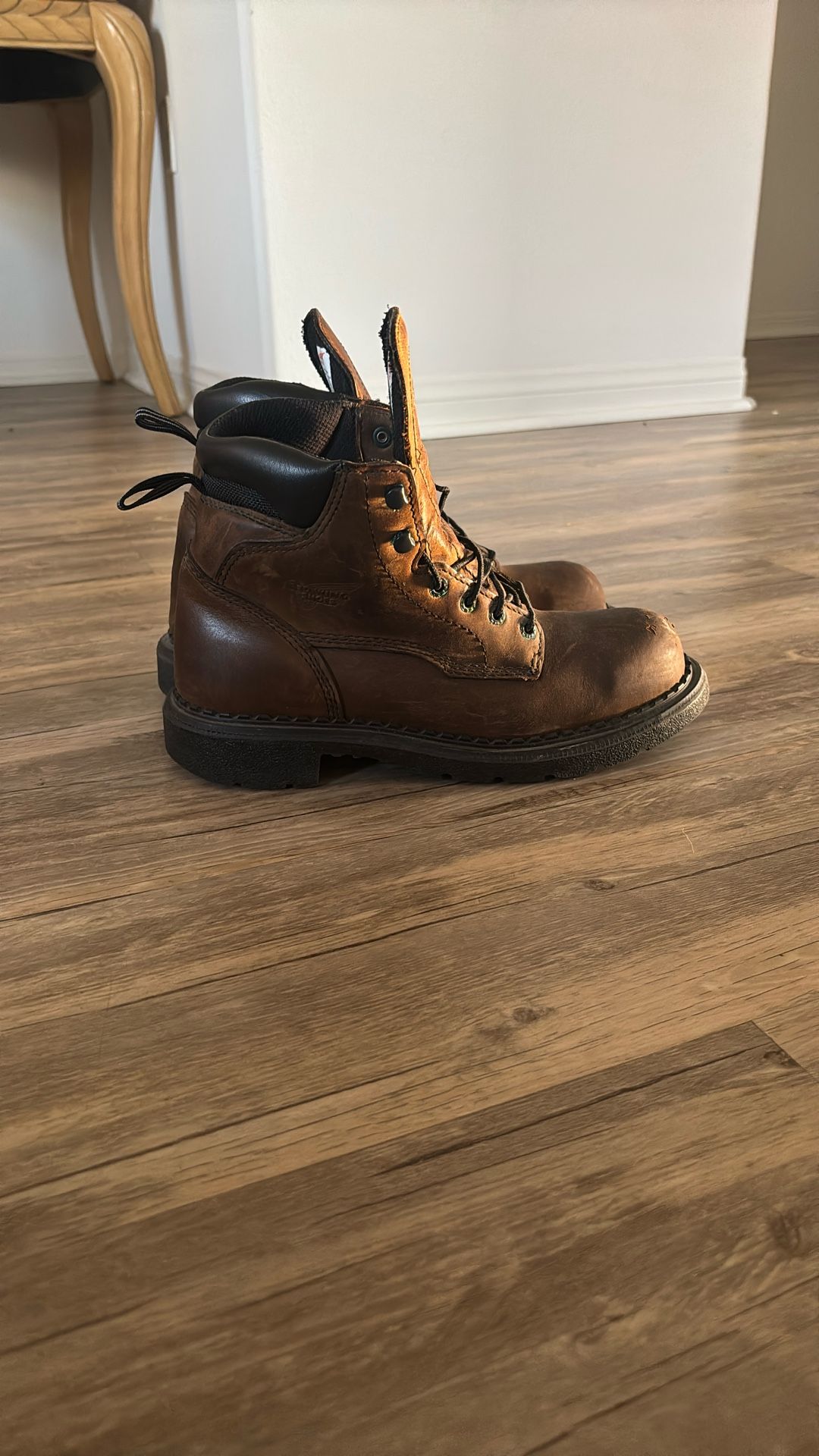 rugged Red Wing 406 Men's Work Boots, size 8.5. These 6-inch tall boots are crafted from durable, high-quality leather and feature Red Wing's renowned Supersole technology for superior comfort and longevity, especially on hard surfaces.