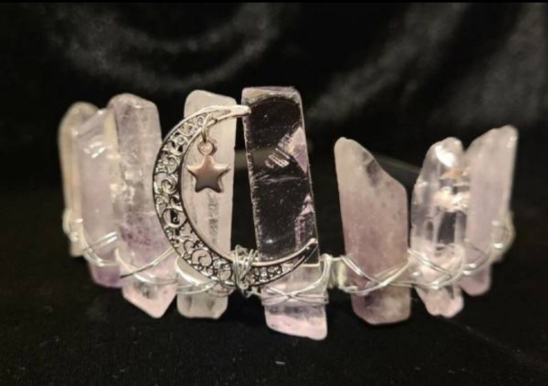 Genuine amethyst tiara. Hand crafted. Silver moon on the front with dangling star. Silver tone metal. Weighs 116 grams. Beautifully crafted piece.