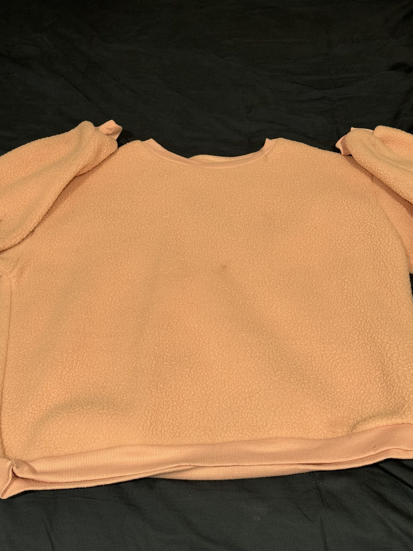 Cute pink sweater very warm and comfy Unbranded but in good condition there is a tiny stain that can be treated No size tag but I’m a medium and this fits me can also fit maybe small to large depending not sure