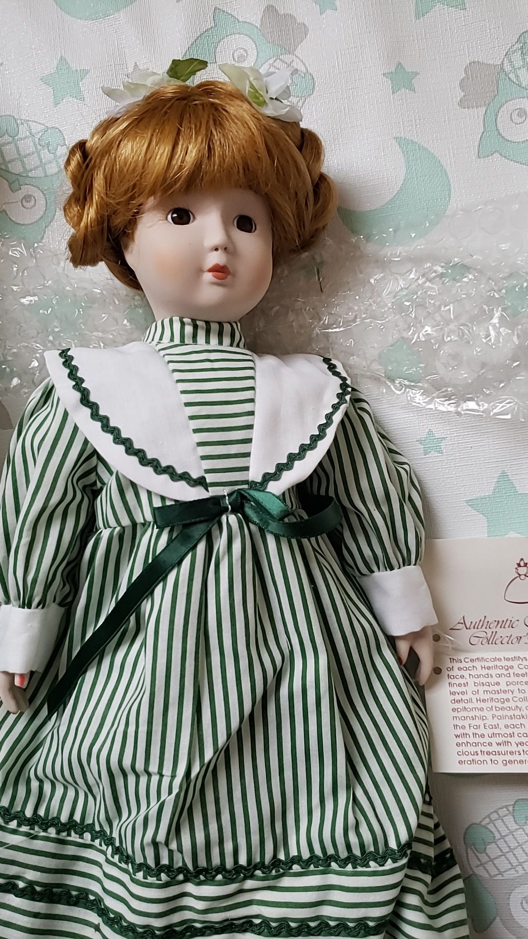 Heritage dolls collectors porsline doll A little damage on shoes due to age (see picture) Crank her back to play beautiful music Comes in original box and certificate. Pet and smoke free home.
