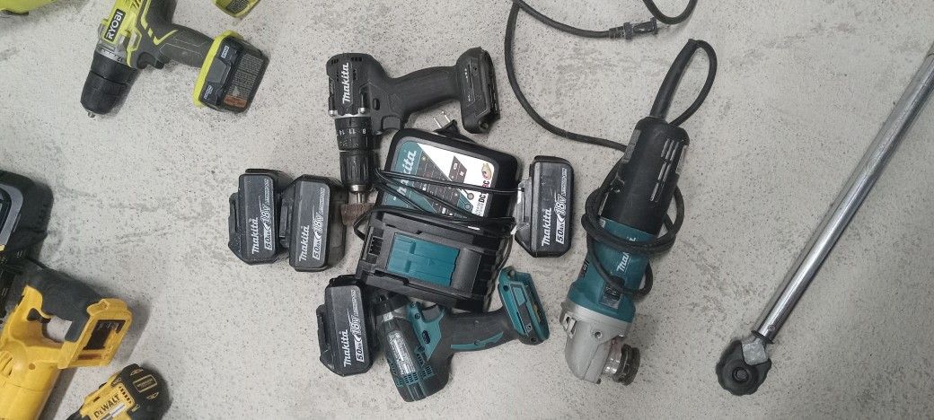 Makita drill Cordless Makita impact Cordless Makita flashlight Cordless - not pictured Makita charger Corded Makita grinder barely used I HAVE LIKE 5 OR 6 BATTERIES ALL IN PERFECT WORKING CONDITION!! I ALSO HAVE QUITE A FEW OTHER BRANDS OF ALOT OF TOOLS AS WELL! SEE PICTURES Keywords(makita, Dewalt, construction, tools, power tools, contractor, drill, screw, impact, Milwaukee)