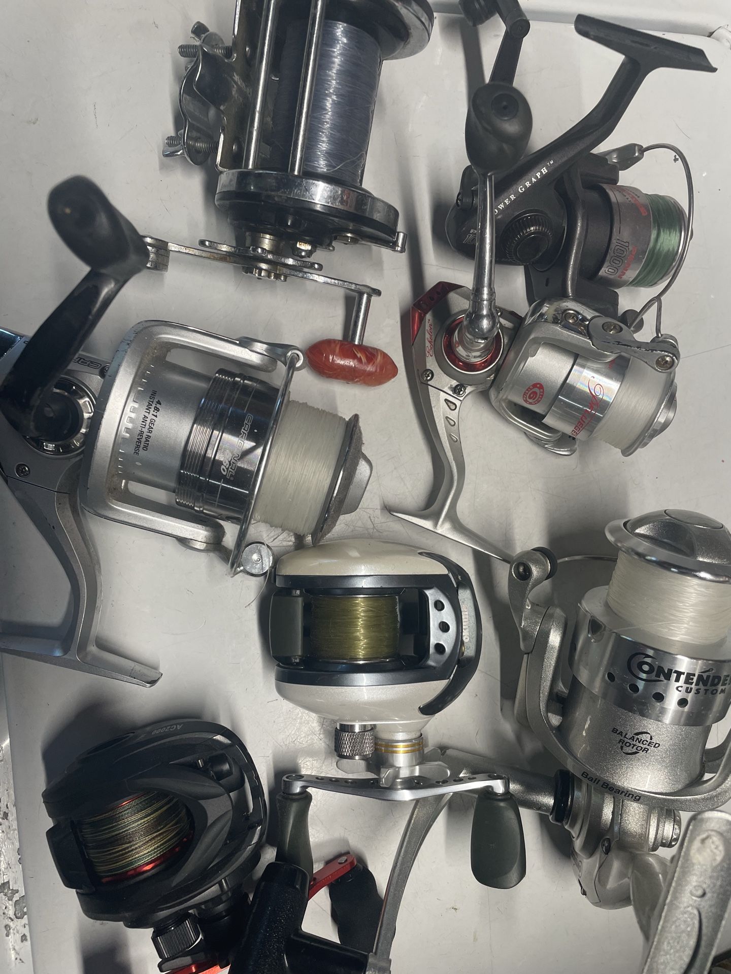 Shakespeare Contender size 60 Spin -$10 Abu Garcia Cardinal S60 Spinning -$10 Baitcast Reel from Temu -$10 Vintage J.C. Higgins Conventional -$20 Vintage Penn Powergraph 1000 Spin -$25 Pflueger Echelon Spinning Reel -$30 Okuma V200A Baitcast Reel -$65 $120 for the bundle Not shown in photo I have - Penn Captiva CV662L from 2004-2005 Rod and Reel Spinning Combo -$50 Vintage Shimano Triton TS-2702 -$50 Vintage Sabre Conventional Rod Model #1500C Golden -$180 $250 for the bundle
