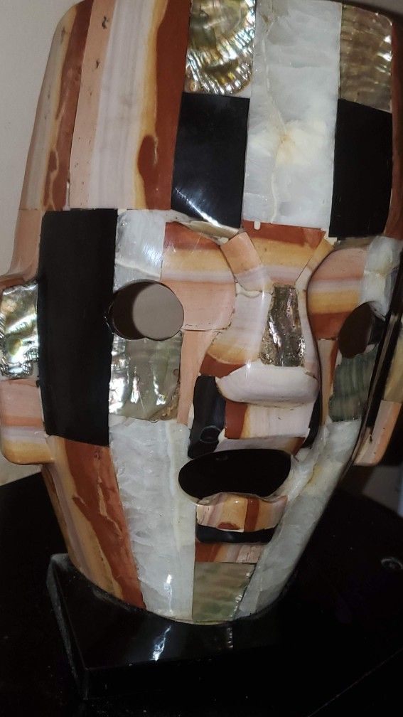 Beautiful jeweled Mayan burial mask. Literally made from abalone, mother of pearl, black onyx (stand) and more. One-of-a-kind collectible. No chips, cracks or breaks of any kind.