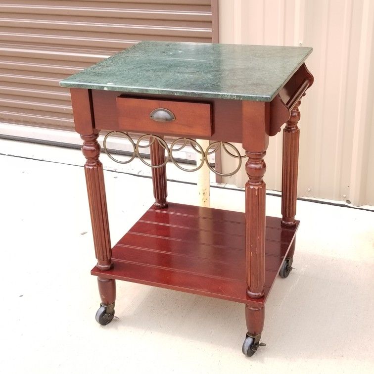 Lovely Vintage 2 Tiered design Dark Wood and Granite Green marble top finish Mobile Bar Cart on Casters One small top drawer with dovetail construction 4 bottle metal wine rack loops solid 4 casters for easy mobility Wood details show some scratches Granite top shows some wear, scuffs and scratches Overall good vintage pre-owned condition H 36" x L 26" x D 24" Great Price! $ 195 FIRM Cash and pick up in Arlington