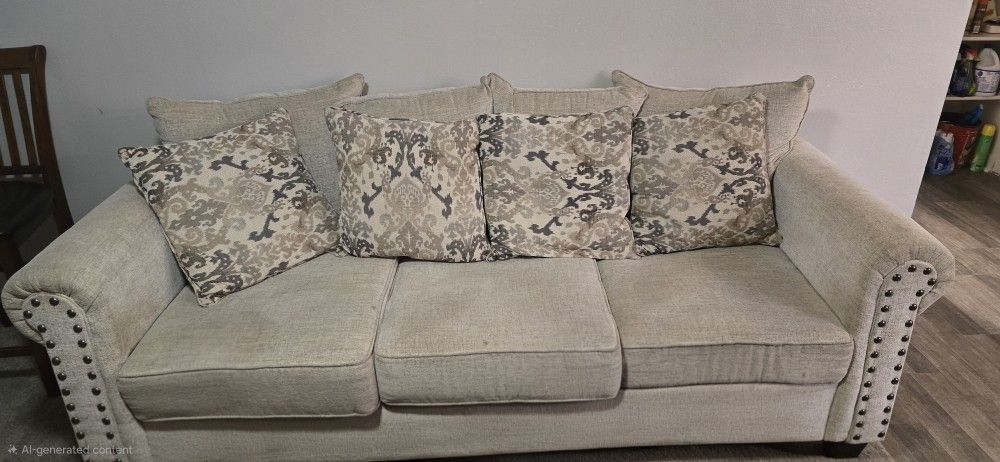 Comfortable 3-seat sofa in neutral beige/gray fabric. Includes 5 matching decorative cushions (shown in photos). Solid frame, supportive cushions, and clean upholstery. Perfect for: Apartment living room Student housing Guest room Short-term rental setup Selling due to relocation. Pickup: Pickup only – Tempe Must be picked up before Dec 27 Notes (important): Clean, from a non-smoking home First come, first served