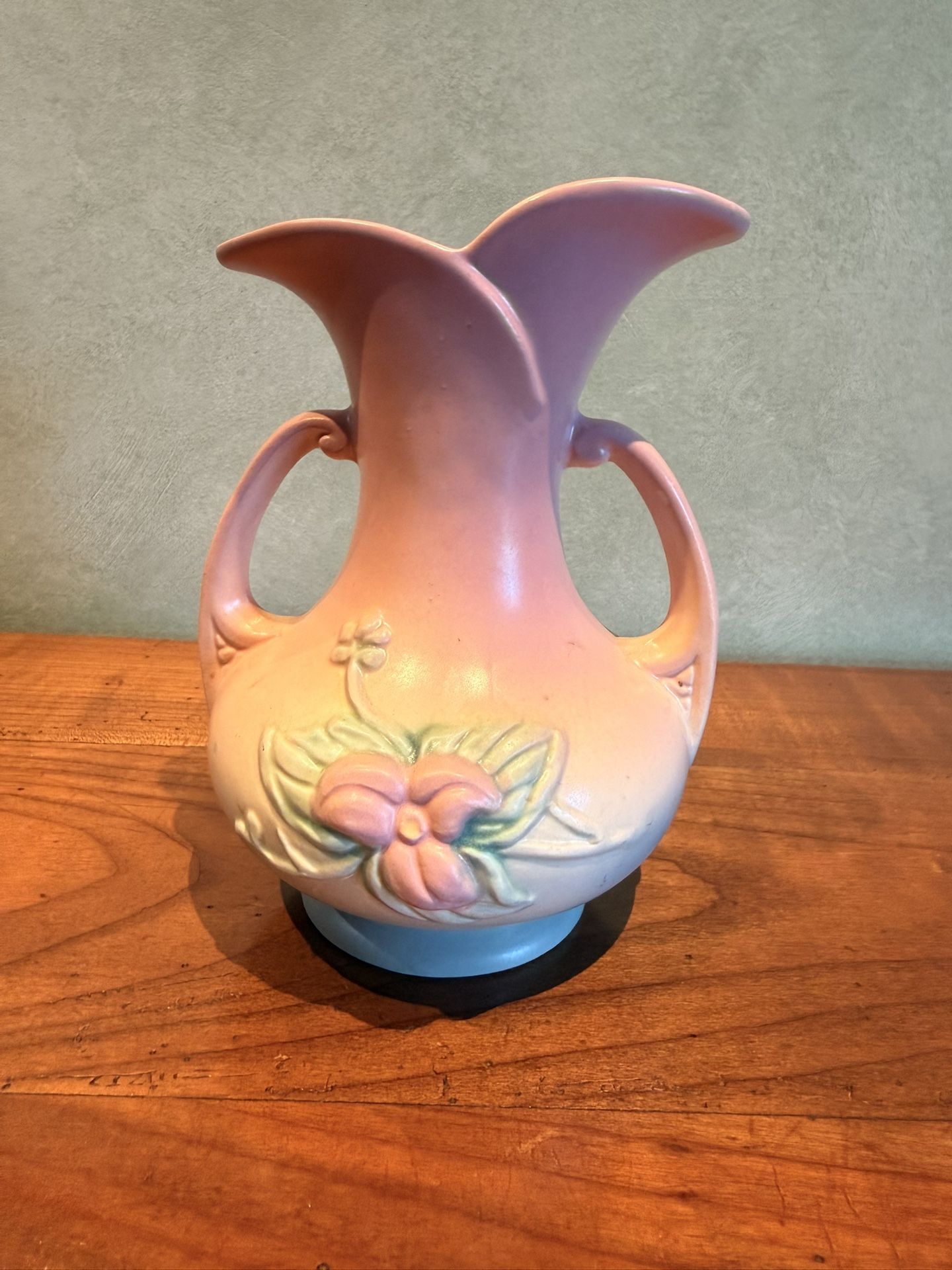 Vintage Hull Art Pottery Dogwood Vase American Art Pottery | c. 1938–1945 This beautiful vintage vase is an authentic example of early Hull Art Pottery production, dating to the late 1930s–early 1940s. The vase features Hull’s signature soft matte pastel glaze, blending blush pink, pale green, and creamy ivory tones, with a raised dogwood flower motif delicately modeled on the body. The form is elegant and balanced, with a double-handled silhouette and a gently flared rim. The underside bears the impressed “Hull Art USA” mark, used during Hull’s early art pottery period and confirming American manufacture prior to World War II. This piece exemplifies the refined craftsmanship and floral aesthetic that made Hull pottery highly collectible. It displays beautifully as a standalone decorative object or as part of an American art pottery collection. Details: • Maker: Hull Art Pottery (USA) • Date: circa 1938–1945 • Material: Matte-glazed earthenware • Decoration: Raised dogwood flower and foliage • Mark: Impressed “Hull Art USA” on base • Style: American art pottery, floral, traditional A charming and timeless example of pre-war American ceramics, prized for its gentle color palette and classic Hull design.